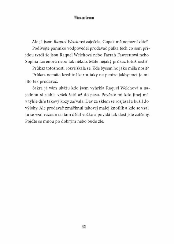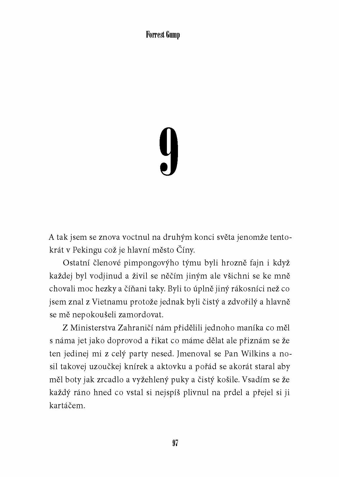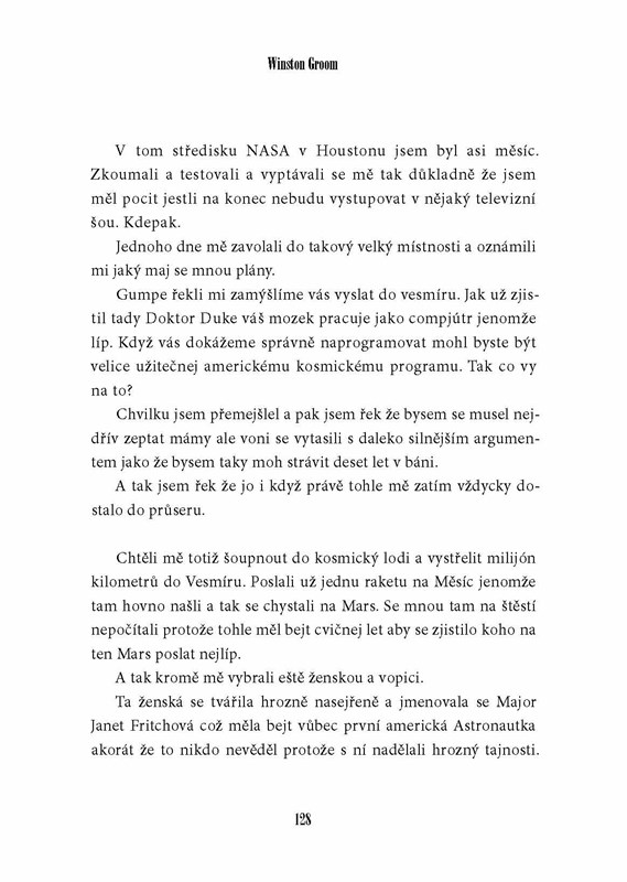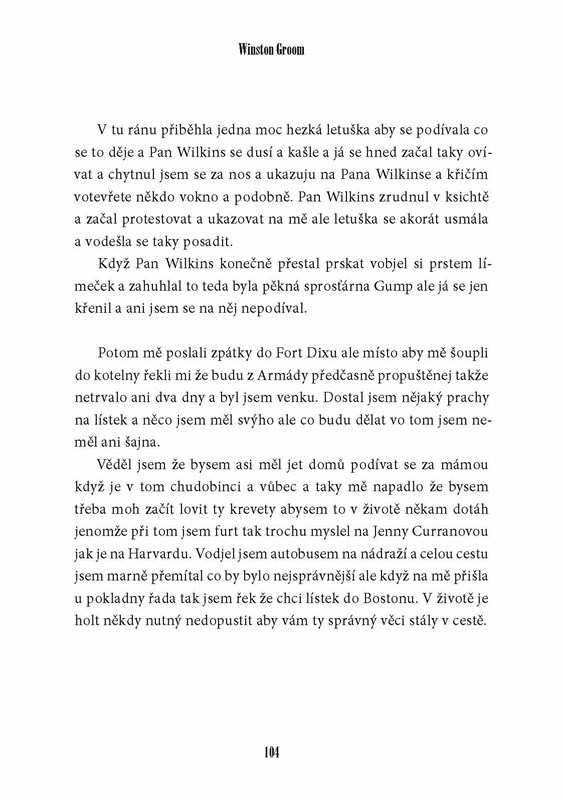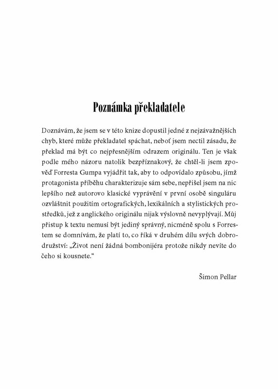 Forrest Gump byl možná trochu opožděné dítě, jeho život byl ale neuvěřitelný. Dostal se na univerzitu, jako voják do Vietnamu, letěl s opicí do vesmíru, žil mezi kanibaly na Nové Guinei, kandidoval na senátora USA, stal se přeborníkem ve wrestlingu, úspěšným podnikatelem a milionářem. S neodolatelnou bezelstností popisuje svůj život i situace, z nichž vždy vyvázl šťastně. Pod povrchem naivního prosťáčka se skrývá mimořádně citlivý člověk, který o svém osudu vypráví s neopakovatelným nadhledem. Na motivy této knížky byl také natočen dnes již slavný film s Tomem Hanksem v hlavní roli.