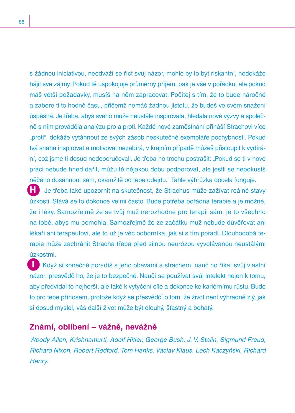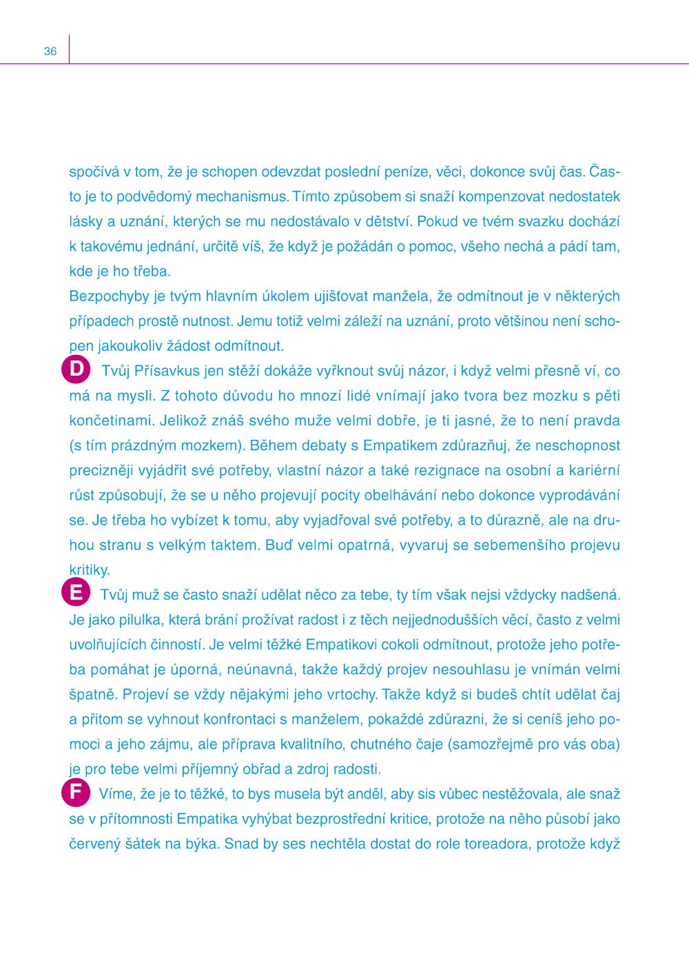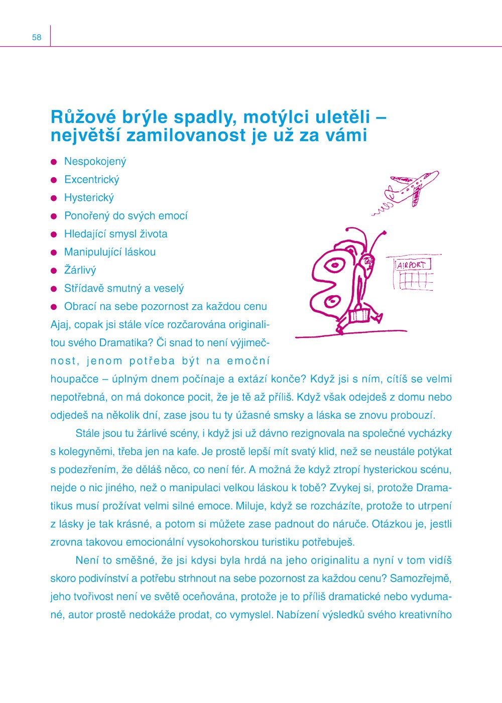 Kniha vás přiměje zamyslet se nad zásadními otázkami (Klofla jste níže popsaného chlapa? Jaký dopad na vaše partnerské soužití má jeho dětství? Proč jste se do něj vlastně zamilovala? Růžové brýle spadly?, …), na něž vám ihned dává odpověď.