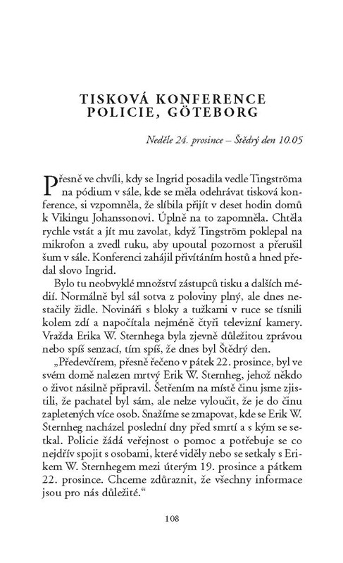 Těsně před Vánocemi je v koupelně své luxusní vily nalezen zavražděný slavný podnikatel Erik W. Sternheg. Po ohledání místa činu je zřejmé, že ho vrah musel z duše nenávidět. Komisařka Ingrid Bergmanová s povzdechem opouští svůj plán na vytoužené klidné prožití svátků a ujímá se mediálně sledovaného případu. Vyšetřování od začátku komplikuje sněhová kalamita a nedostatek personálu, ale hlavně neochota vyslýchaných cokoli o zavražděném prozradit. Zdánlivě všemi oblíbený příslušník göteborské smetánky skrýval mnohá temná tajemství, která postupně vyplouvají na povrch. Najednou se zdá, že motiv k vraždě měl v jeho okolí kdekdo. Aby toho nebylo na Ingrid málo, zároveň musí pátrat po muži, který soustavně pronásleduje a vydírá její kolegyni Malin. Vše nasvědčuje tomu, že dotyčný stalker je z řad policie. Podaří se Ingrid vyřešit oba případy?