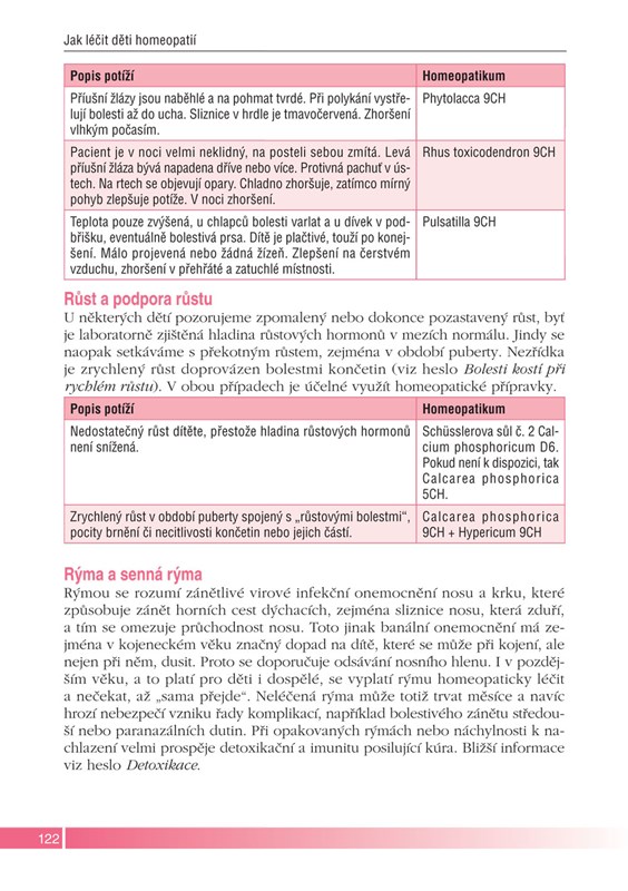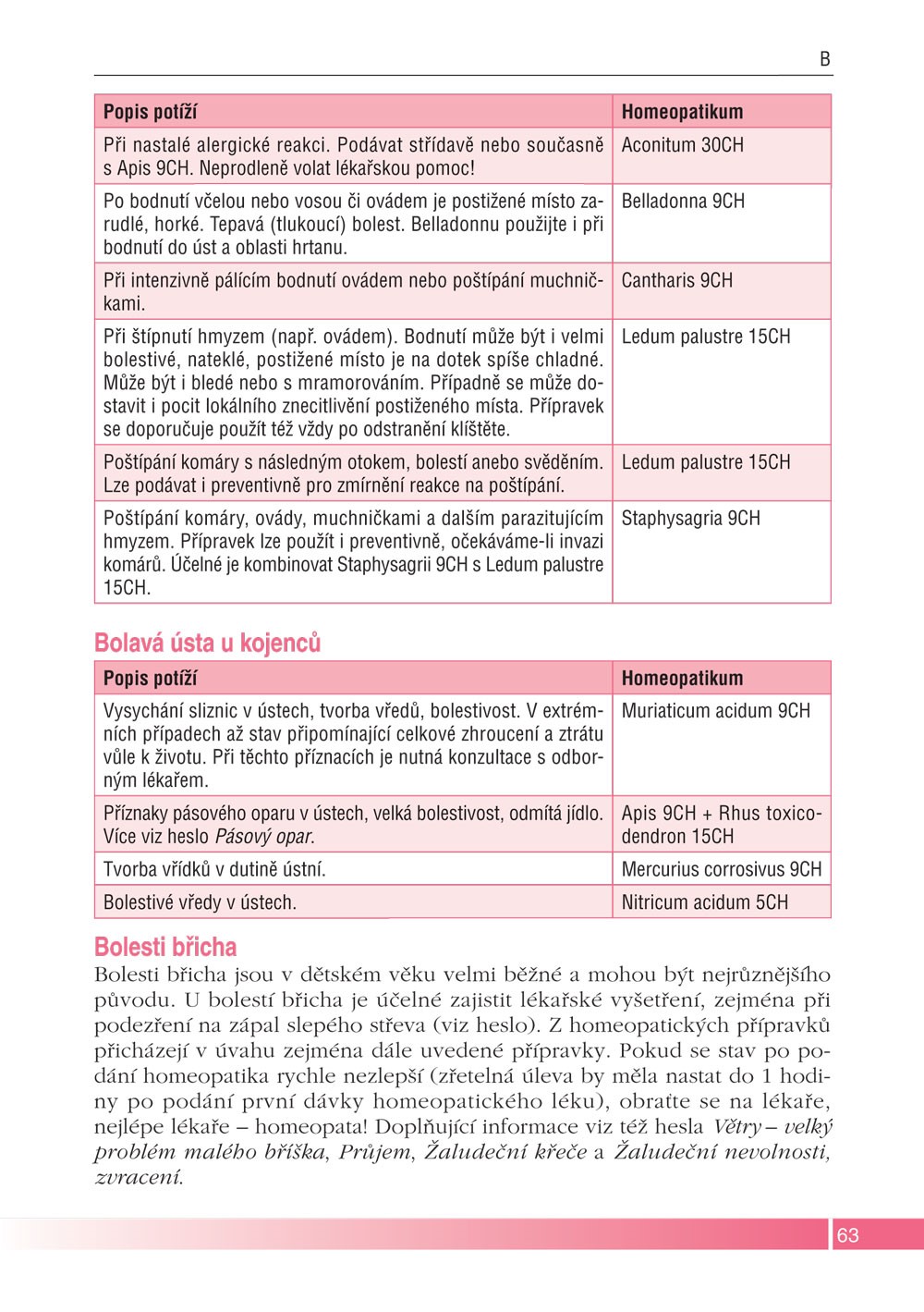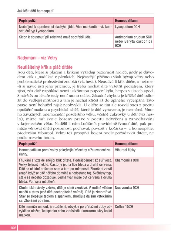 V knize naleznete doporučená homeopatika v případě alergie, angíny, bolestí hlavy, astmatu, atopického ekzému, bodnutí hmyzem, bolesti břicha, cestovní nevolnosti, děsivých snů, horečky, hyperaktivity, chřipky a virózy, kašle, koktavosti, krvácení z nosu, nadýmání, neutišitelného křiku, nočního pomočování, novorozenecké žloutenky, planých neštovic, prořezávání zoubků, průjmu, reakce po očkování, slunečního úpalu, zánětu spojivek, zánětu středního ucha, zvracení a mnoha dalších.