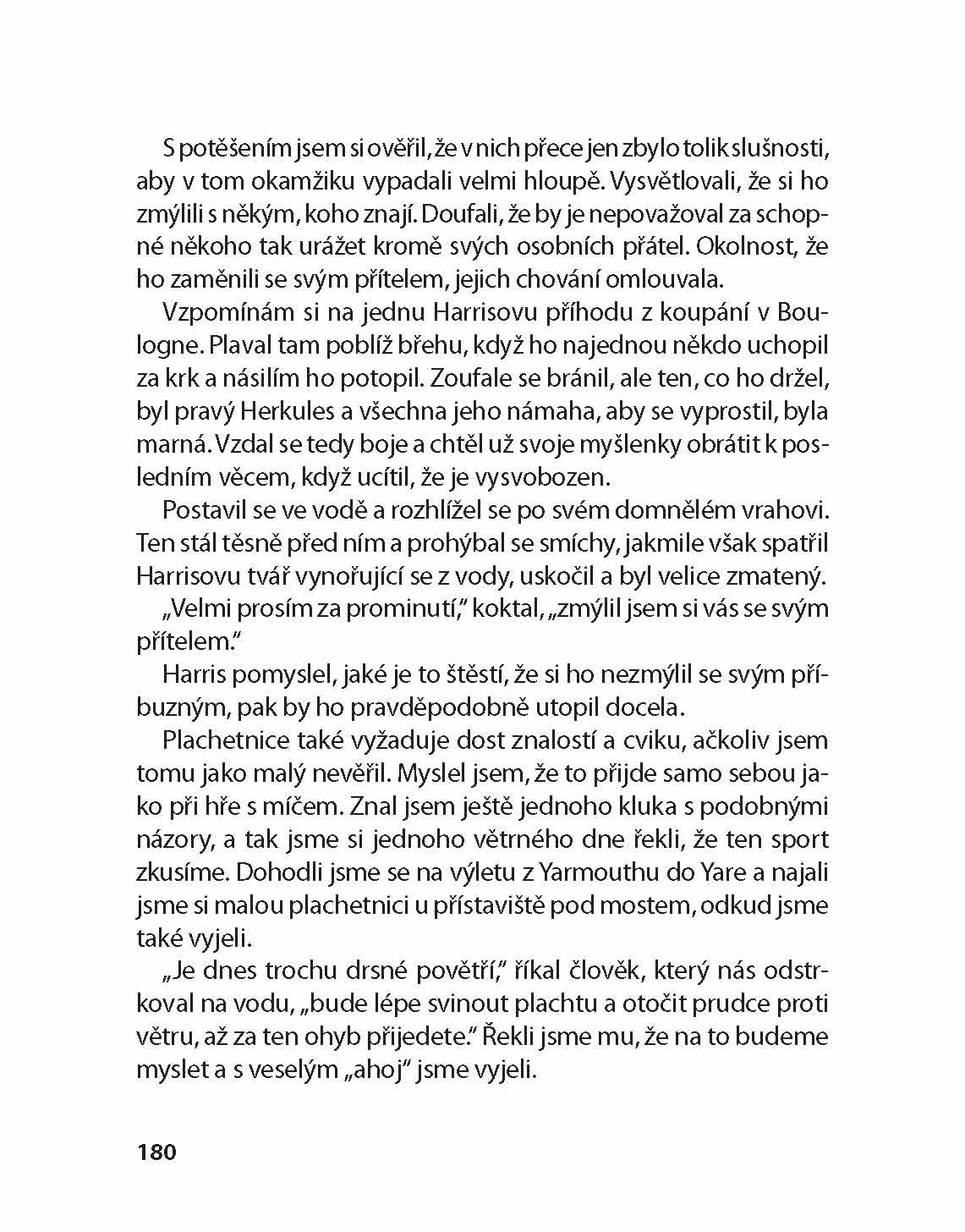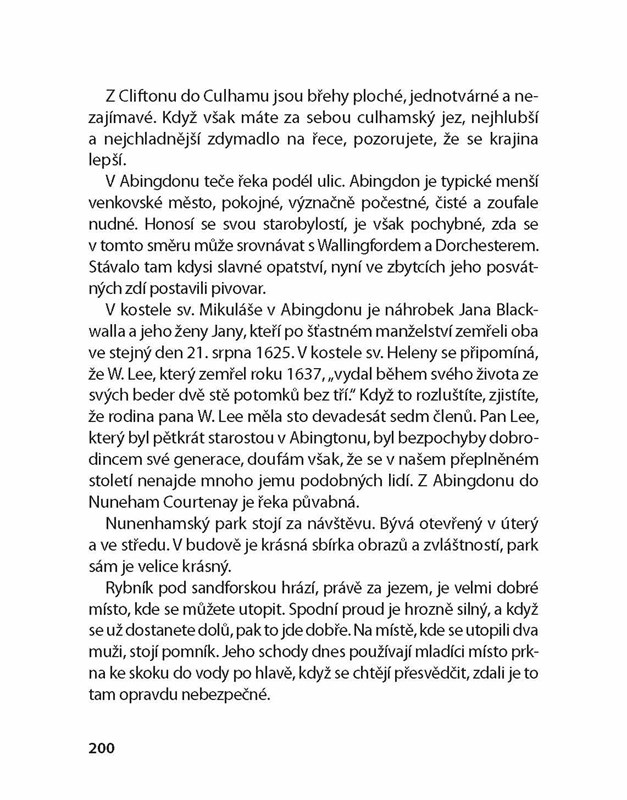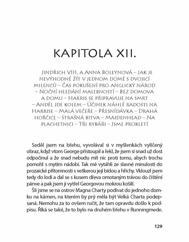 „Kouzlo této knihy není ani tak v literárních kvalitách, rozsahu nebo důležitosti sdělení, spíš v upřímné jednoduchosti,“ píše Jerome Klapka Jerome v úvodu svého humorného vyprávění. Tři muži ve člunu zachycují příhody a nehody, které autor zažil při sjíždění řeky Temže ve společnosti svých dvou přátel George a Harrise a pejska Montmorencyho. Čtenář se mimo jiné dozví o zlomyslnosti kartáčku na zuby či o sveřeposti čajových kotlíků a o tom, jak jí čelit. Přečte si poučné poznámky o vyřezávaném dubu a o životě vůbec a zjistí, jak je nevýhodné žít v jednom domě s dvojicí milenců. Vůně léta, šumění řeky a kultivovaný anglický humor dýchnou ze stránek této nezapomenutelné knihy i po více než sto letech od jejího vzniku.