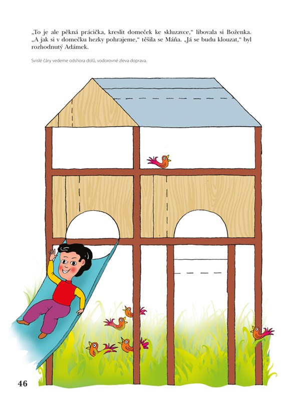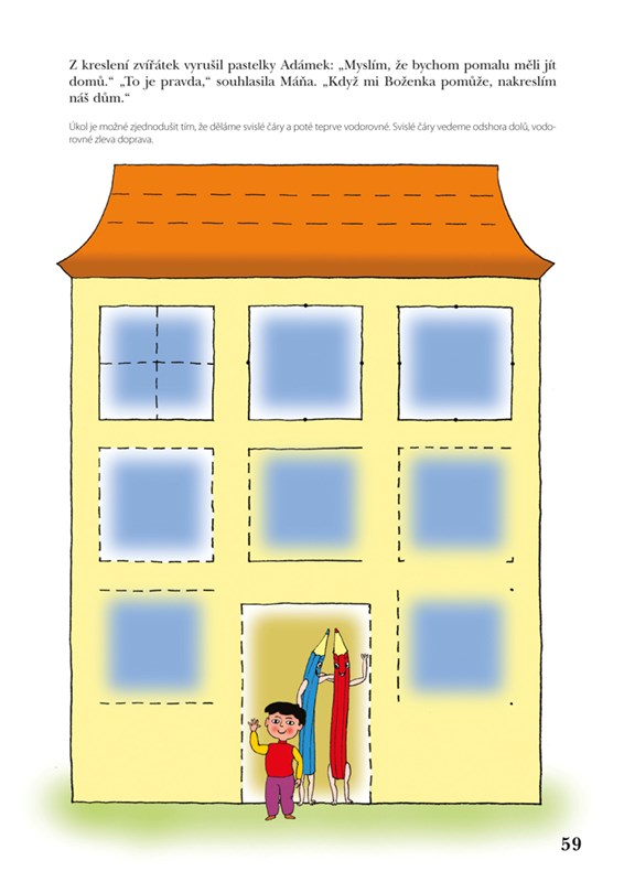 Dítě bude spolu s pastelkami Boženkou a Máňou plnit zajímavé úkoly vyplývající z příběhu, který mu budete číst. Tak se naučí pozorně poslouchat, rozumět slovům, dozví se zajímavé věci o přírodě, zvířatech i lidech. Každý úspěch bude znamenat povzbuzení pro další hru. Pro nás dospělé to však znamená vést dítě k přirozenému postupu a respektovat jeho individuální vývoj. Jak postupovat, abyste spolu s dítkem měli radost ze společné práce, se dozvíte v autorčině dopise na konci knihy. Ten si nejdříve pozorně přečtěte. Vyvarujete se tak přílišných nároků na dítě, uvědomíte si, jak je důležité projevit radost z výtvoru, který je zpočátku – očima dospělého – málo zdařilý. Proto postupujte pomalu i v případě, že bude dítě chtít pokreslit všechny strany najednou. Doporučuji každý den jednu dvě stránky a čtení na pokračování. Dítě i vy se budete těšit na další společné cvičení, v němž můžete po vyplnění první „knihy kreslení“ pokračovat v dalších publikacích, které vám autorka také doporučí.