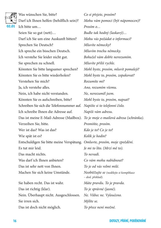 Ve dvanácti lekcích se seznámíte s nejdůležitějšími konverzačními tématy a reálnými situacemi. V každé lekci najdete slovní zásobu k danému tématu, fráze, jazykové tipy a rady. Slovní zásoba i fráze čerpají ze současného jazyka, a tak si můžete být jisti, že se učíte výrazy, které se skutečně v běžné řeči používají. Řada zábavných dialogů přispěje k osvojení a upevnění nové slovní zásoby. Kromě toho se pomocí českého překladu rozhovorů můžete snadno naučit další užitečné výrazy. Cvičení na konci každé lekce pomohou ověřit, jestli jste zvládli probranou látku a jestli jste schopni čelit reálným situacím v německy mluvícím prostředí. Řešení cvičení a přepisy nahrávek najdete v závěru každé lekce.