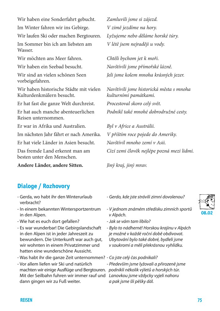 Konverzační příručka a cvičebnice v jednom je určena pro mírně pokročilé studenty němčiny, kteří si chtějí rozšířit slovní zásobu, konverzační a jazykové dovednosti. Velká pozornost je věnována také rozvoji poslechových schopností.