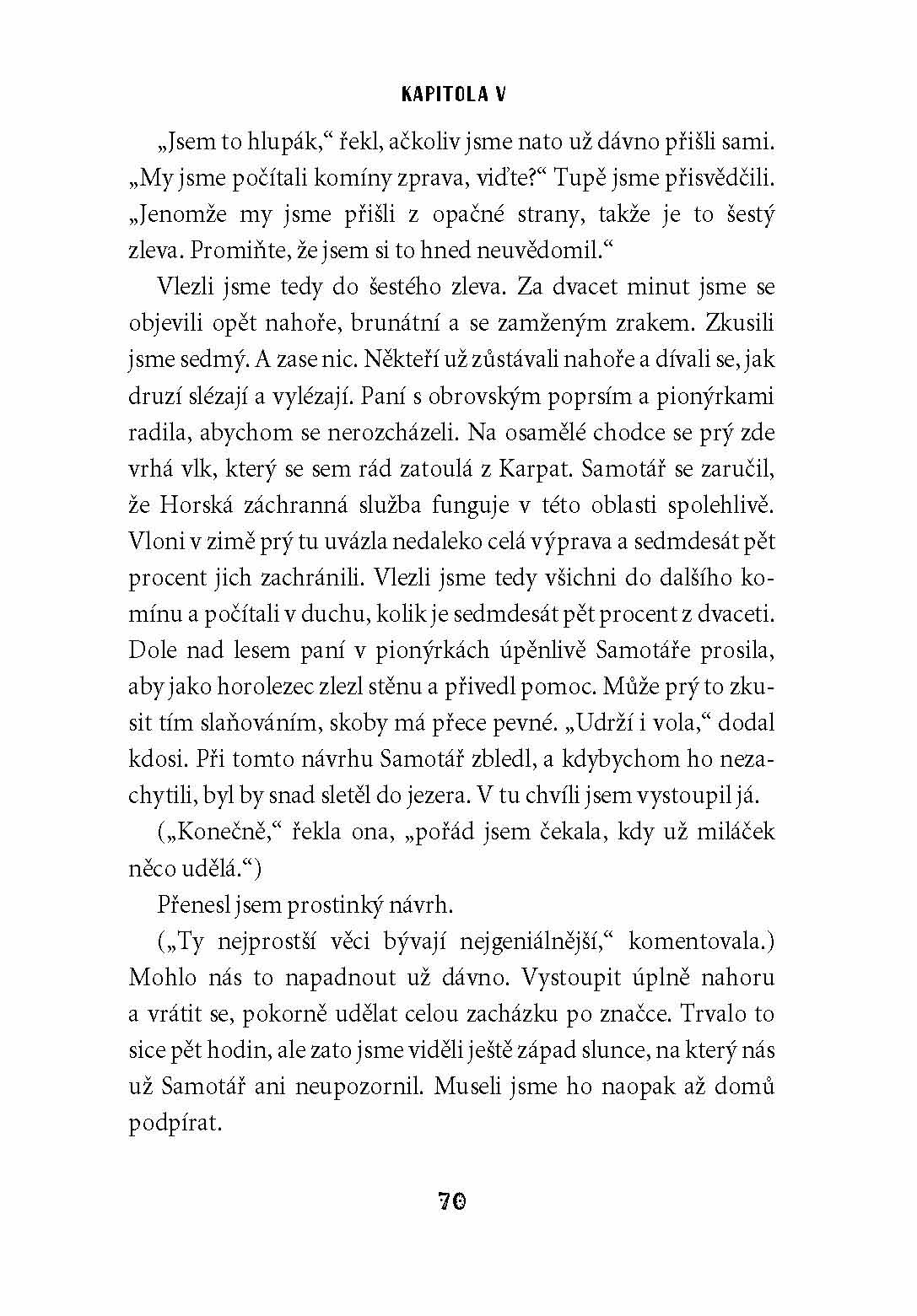 Humorná novela plná lehké ironie a situačního humoru o netradičním pojetí předsvatební cesty po horách a řekách, která se promění v dobrodružnou výpravu, při níž oba protagonisté bezděky odhalují své přednosti i slabiny.