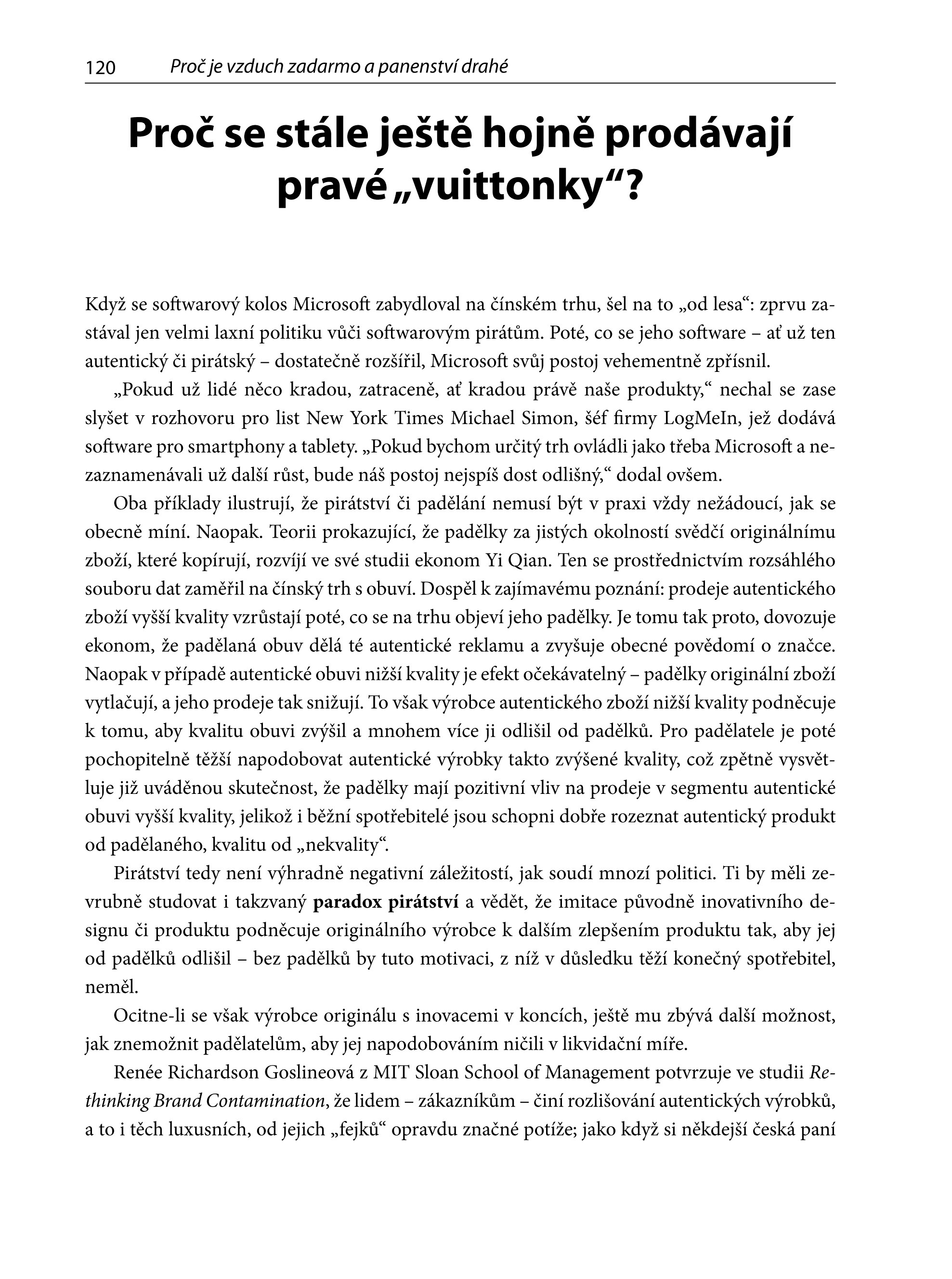 „Kovandovy črty na pomezí ekonomie, sociální psychologie, sociobiologie a antropologie vyplňují citelnou mezeru v domácí popularizační literatuře, jež zoufale zaostává za produkcí zejména anglosaskou, která nás sice svým šarmem oslňuje v překladech jako Špekonomie (Dubner a Levitt) či Proč muži neposlouchají a ženy neumí číst v mapách (Allan a Barbara Peasovi), ale postrádá autenticitu domácího původu.“