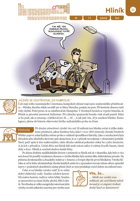 Chemické prvky tvoří naši potravu, naše těla, předměty v dílně, koupelně, spíži… Mnohé najdeme i tam, kde bychom je vůbec nečekali. Jejich objevování, výroba i používání mají navíc zajímavou historii i současnost. V této knize jich je přes čtyřicet. A jsou to právě ty, které se nejčastěji objevují ve školních vzdělávacích programech českých škol, a tedy i v písemkách. Pojďme se s nimi seznámit blíž...
