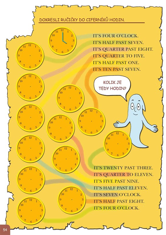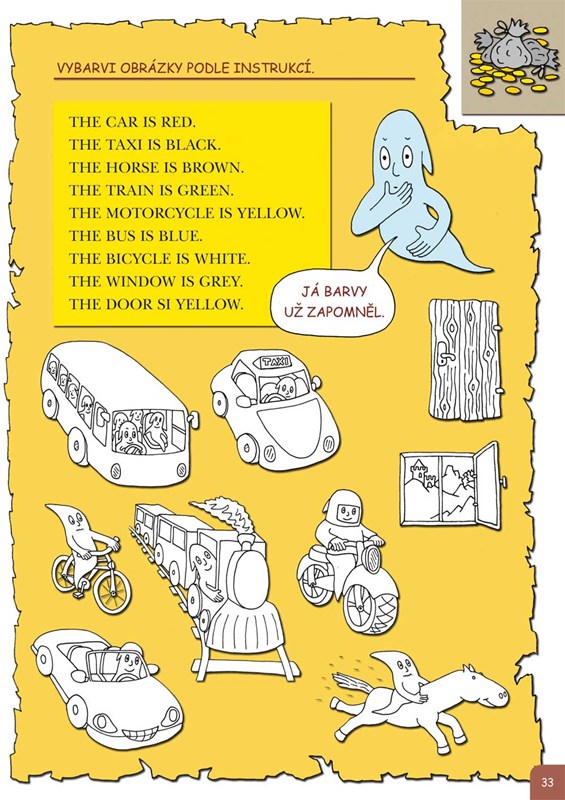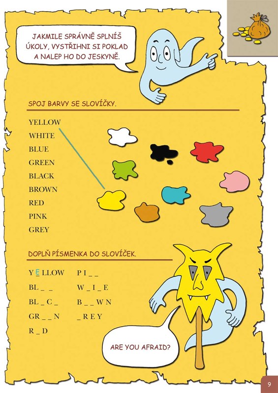 Kamarádský duch zavede malé čtenáře na svůj strašidelný hrad, kde každý dostane příležitost splnit rozmanité úkoly a získat drahocenné poklady, které si může lepit do vlastní soukromé pokladnice. Tu je možné z knihy vyjmout. Zábavnou formou se při tom všem procvičí základy gramatiky i slovní zásoba: barvy, čísla, ovoce a zelenina, dopravní prostředky, povolání, dny, hodiny, části lidského těla, oblečení a mnohé další. Kniha je plná názorných, barevných a legračních obrázků.