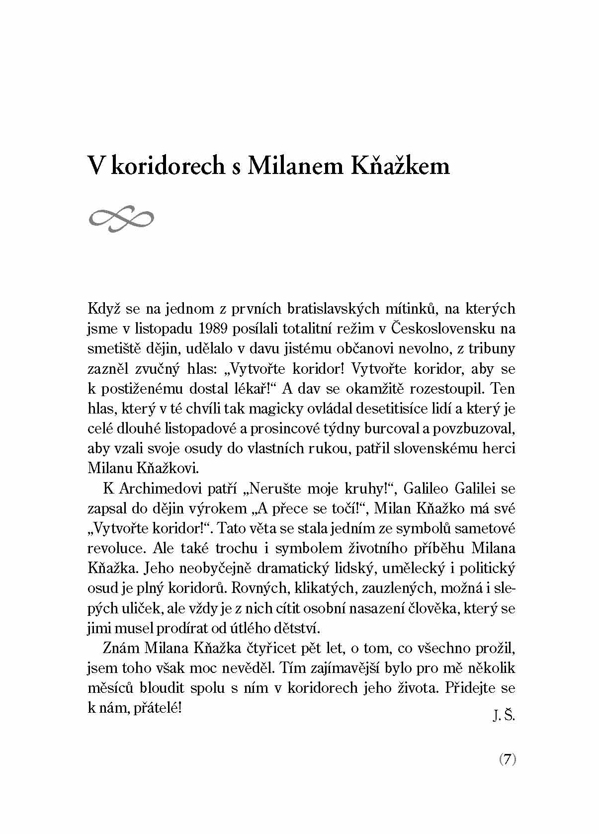 Známý slovenský herec a politik Milan Kňažko představuje v rozhovorech s Jánem Štrasserem svůj neobyčejně dramatický lidský, umělecký i politický osud, jenž je, jak sám říká, plný koridorů. Rovných, klikatých, zauzlených, možná i slepých uliček, ale vždy je z nich cítit osobní nasazení člověka, který se jimi musel prodírat od útlého dětství.