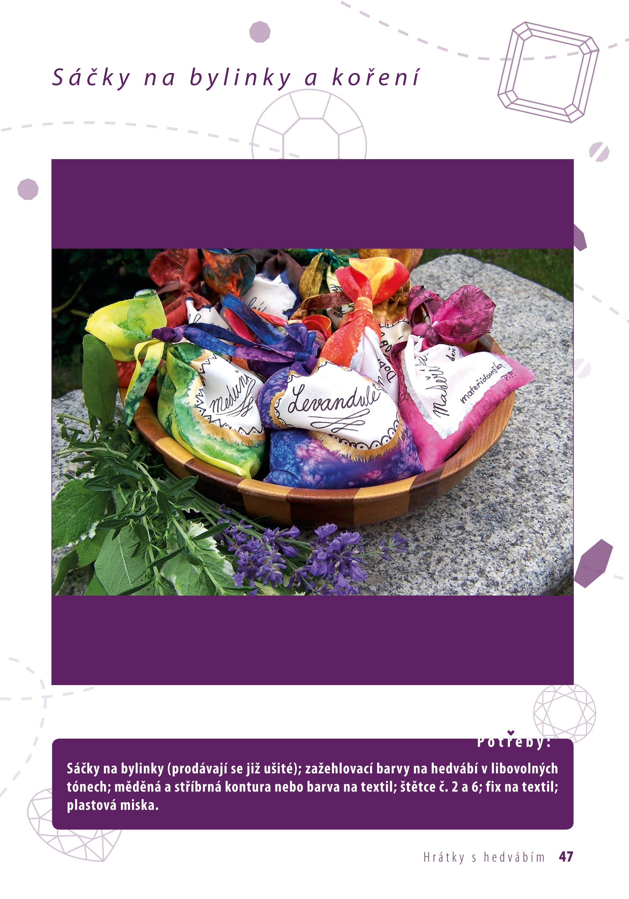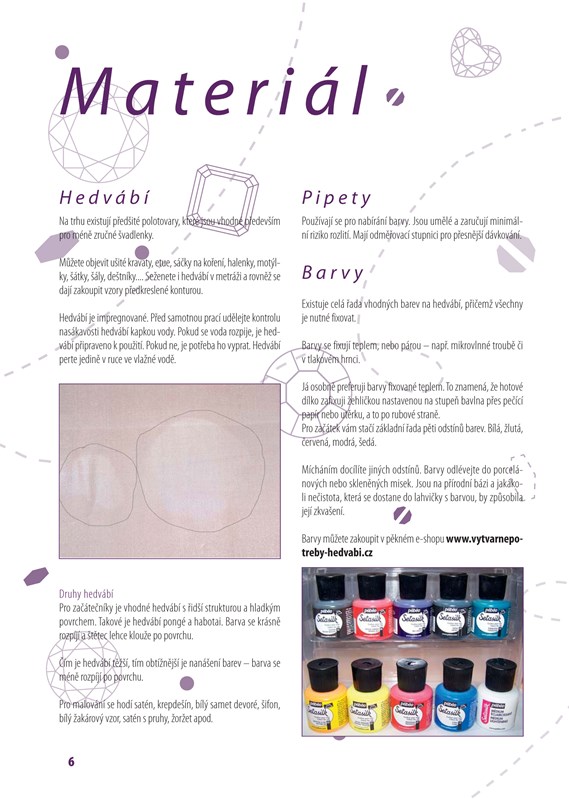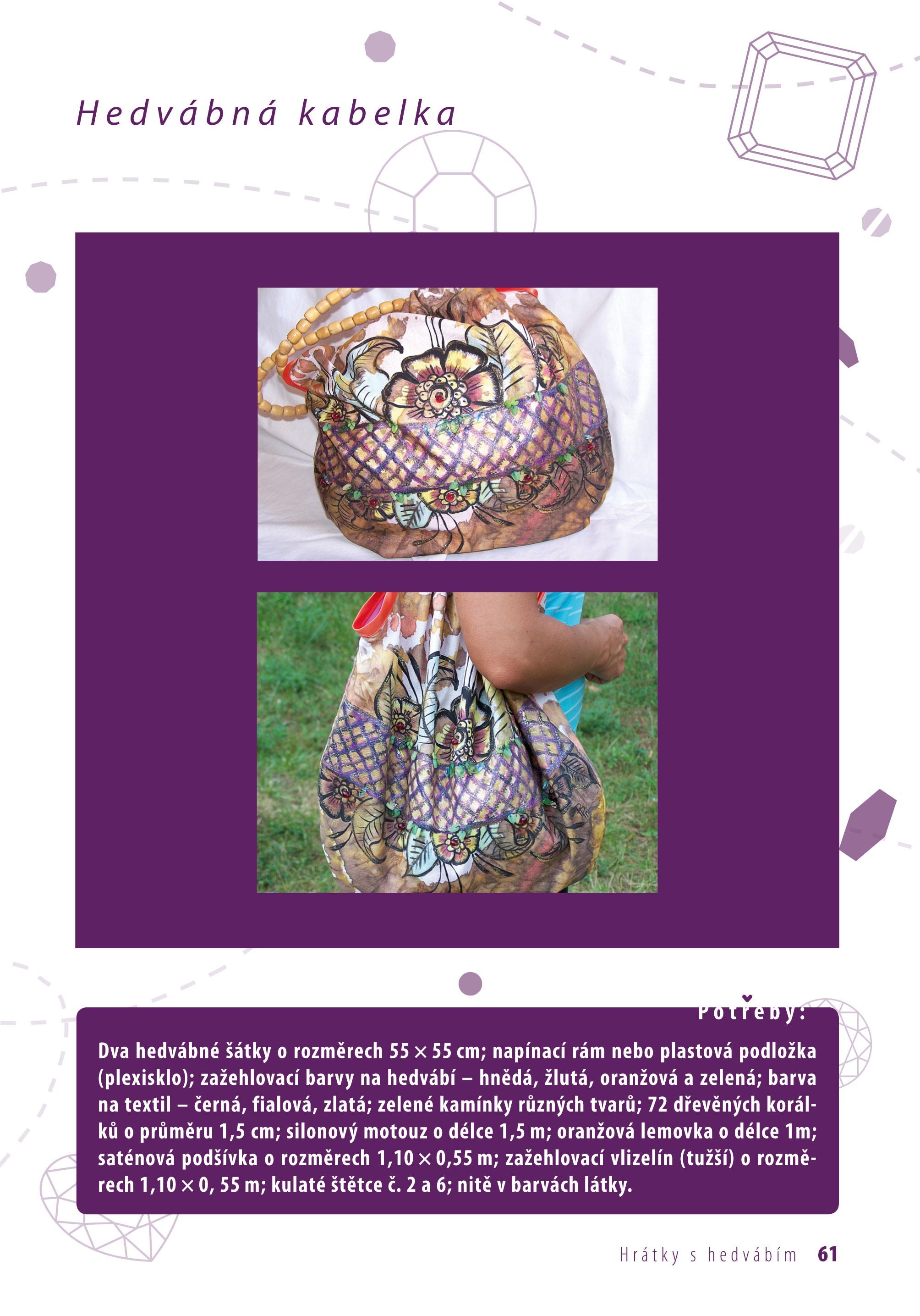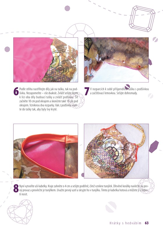 Pro všechny zájemce o práci s hedvábím jsme připravili zbrusu novou knihu, která představuje 17 projektů vhodných i pro začátečníky. Autorka vás seznámí s materiály, nářadím i pomůckami dostupnými na našem trhu, poradí vám se zařízením pracovního místa a provede vás technikami práce s hedvábím. Výrobní postupy jsou popsány krok za krokem a doprovázeny fotografiemi, které vás povedou ke zdárnému cíli. Už teď se můžete těšit na hedvábné šátky, kabelku, tuniku, ozdobný náramek či servírovací podložku.