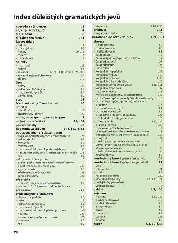 Na konci učebnice jsou zařazeny souhrnné abecedně řazené slovníky česko-italský a italsko-český, přehled časování sloves, přehled nejčastěji používaných předložek a předložkových výrazů a gramatika pro studenty, kteří si chtějí prohloubit svoje znalosti.