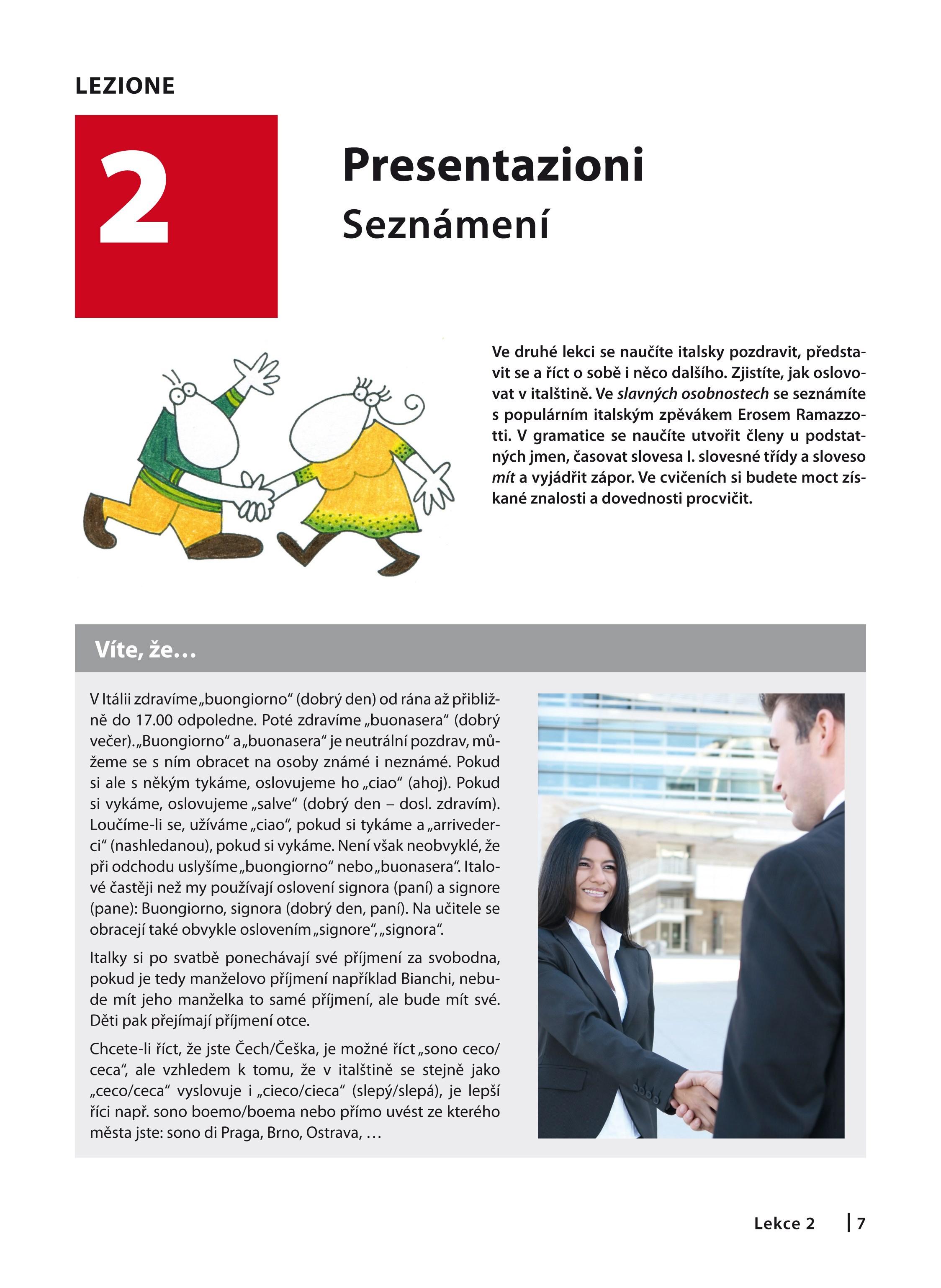 Publikace obsahuje 40 lekcí, včetně 7 lekcí opakovacích. Italský text Slavné osobnosti s překladem do češtiny vás seznámí s řadou význačných osobností italského původu. Díky rubrice Víte, že… si rozšíříte znalosti italských reálií, oddíl A ještě něco navíc… doplní informace k tématu lekce. Jistě oceníte oddíl Frazeologie, věnovaný obtížnějším frázím z výchozího textu, dále pak naleznete výklad gramatiky. Pestrá a živá cvičení napomohou upevnit novou slovní zásobu a gramatiku. Vtipné obrázky přispějí k lepšímu zapamatování probírané látky.