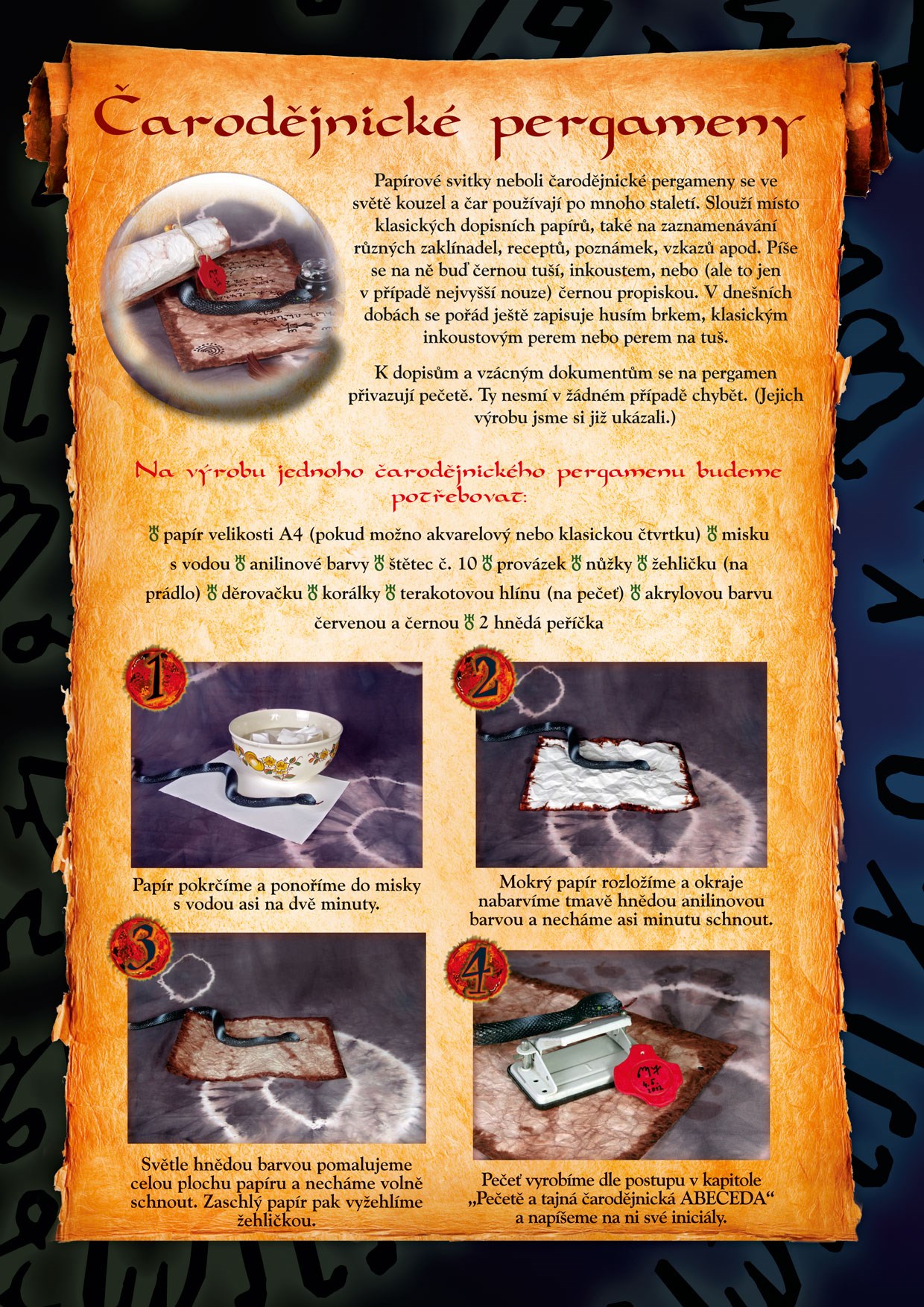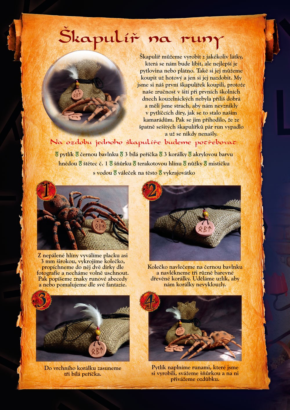 Naleznete v ní podrobné postupy doprovázené fotografiemi, s jejichž pomocí si budete moci vyrobit první čarodějnickou výbavu.