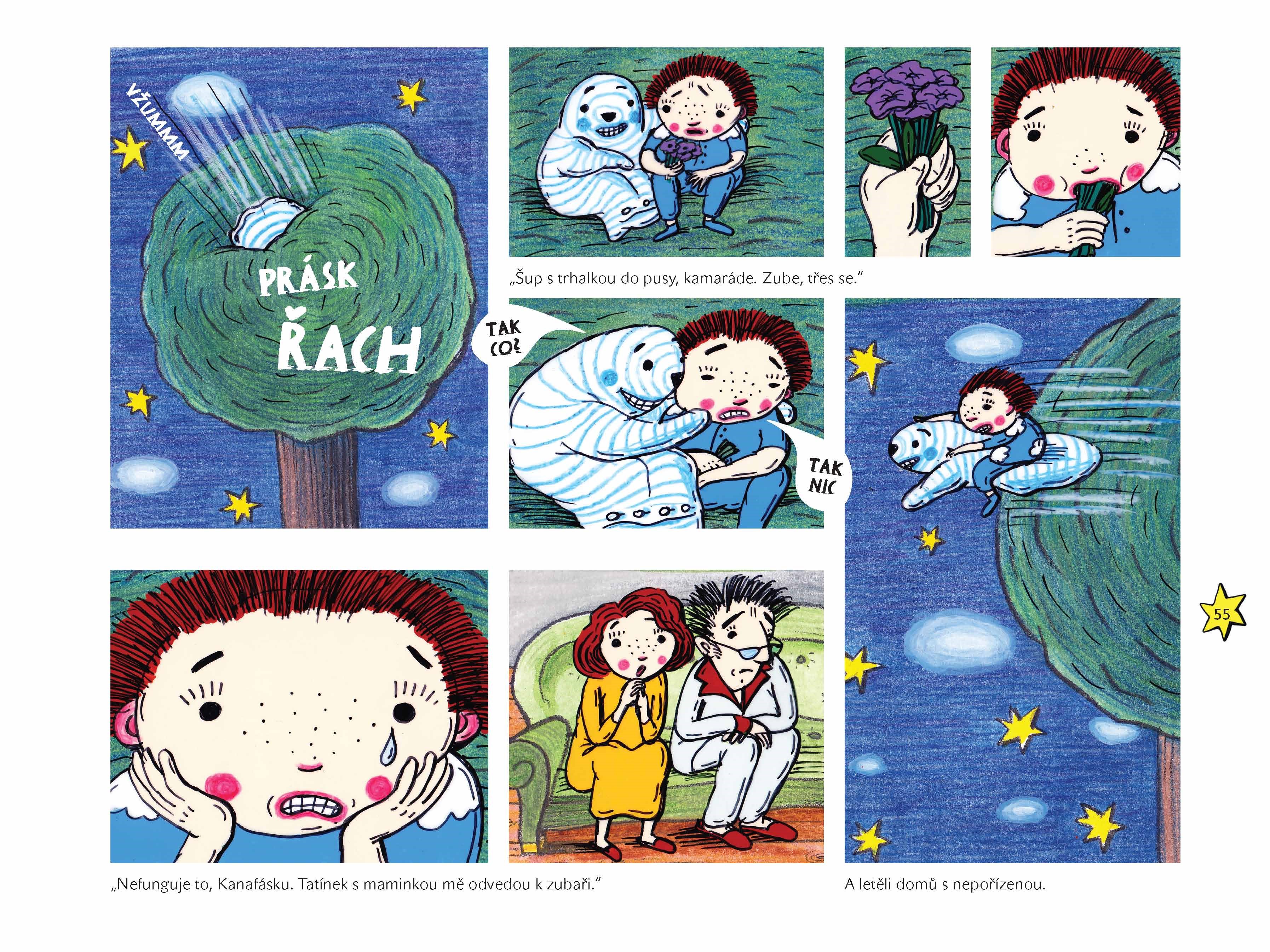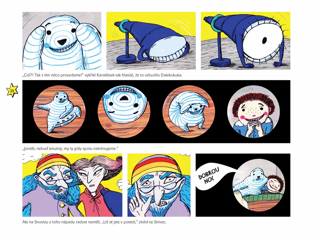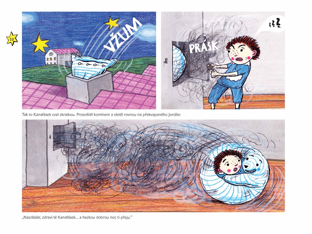A ti si na každé dítě, které ještě nespí, pěkně posvítí. Jenže na nespavce Jonáše nic neplatí…“ A když se do toho vloží rozverná uspávací peřina Kanafásek, není o noční dobrodružství nouze. Pokud chcete vědět a VIDĚT, jaké příhody Kanafásek s Jonášem zažili, skočte do kouzelného světa téhle knížky.