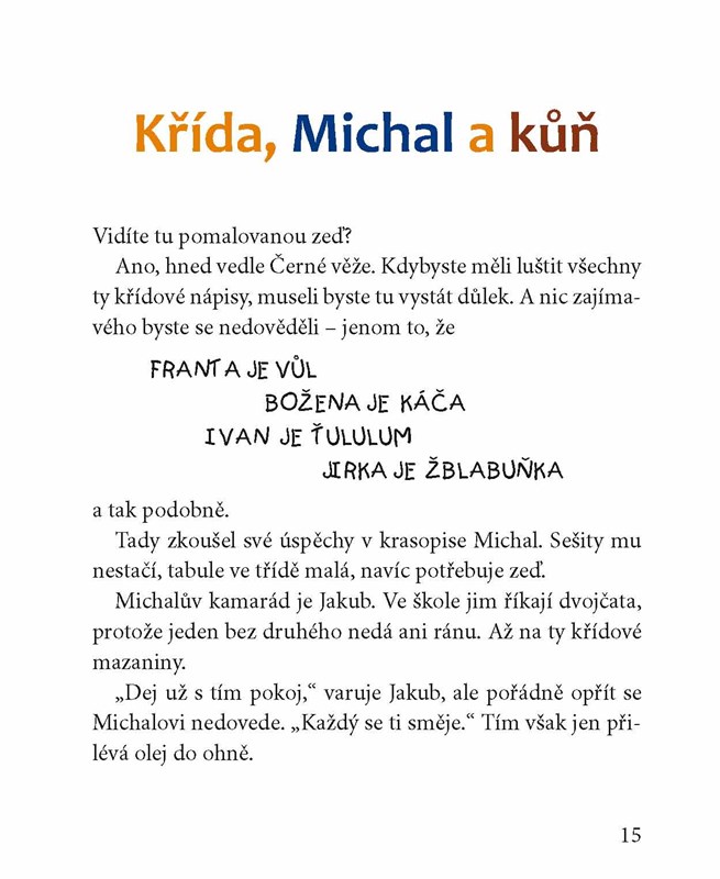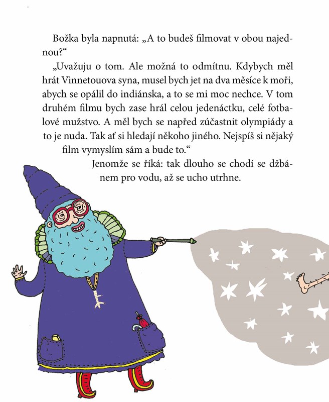 Jak je možné, že se Jakub zničehonic proměnil v koně? Nebo že si malá Anežka v obchodě koupila bundu, která není modrá, ale moudrá, a navíc mluví? Anebo že na Jindru doma čeká velbloud, kterého si vylhal? To máte tak. Občas vrzne branka Černé věže a objeví se tajemná dívka. Vypadá pokaždé trochu jinak, ale vždycky má v ruce černou hůlku se stříbrným knoflíkem. Jen tak trochu s ní mávne, a už se dějí neuvěřitelné věci.