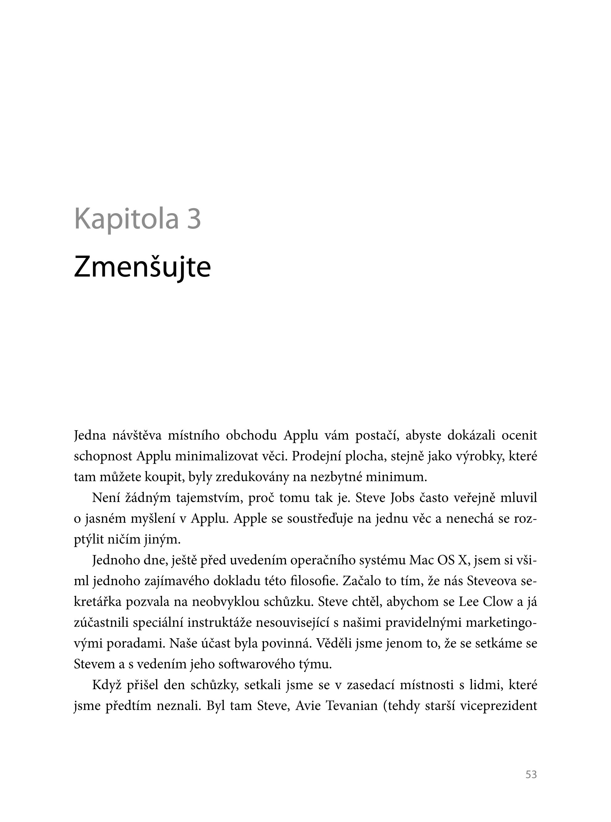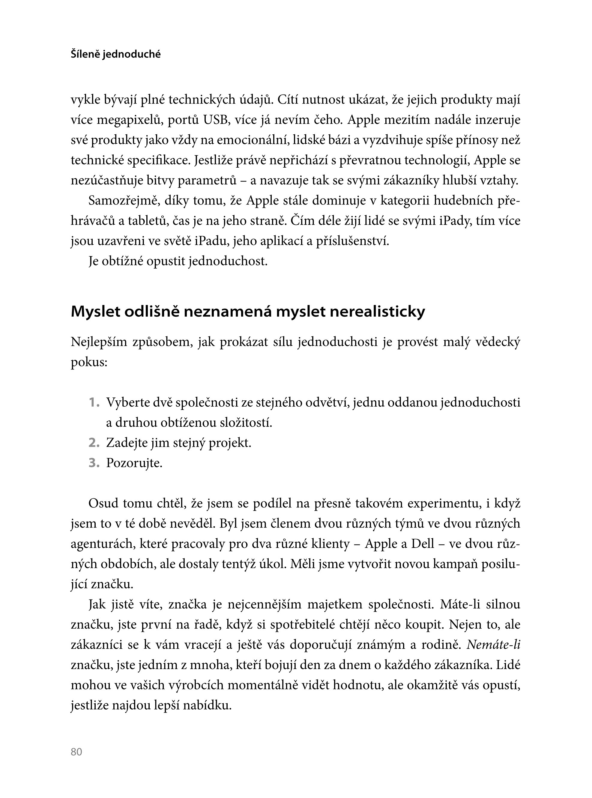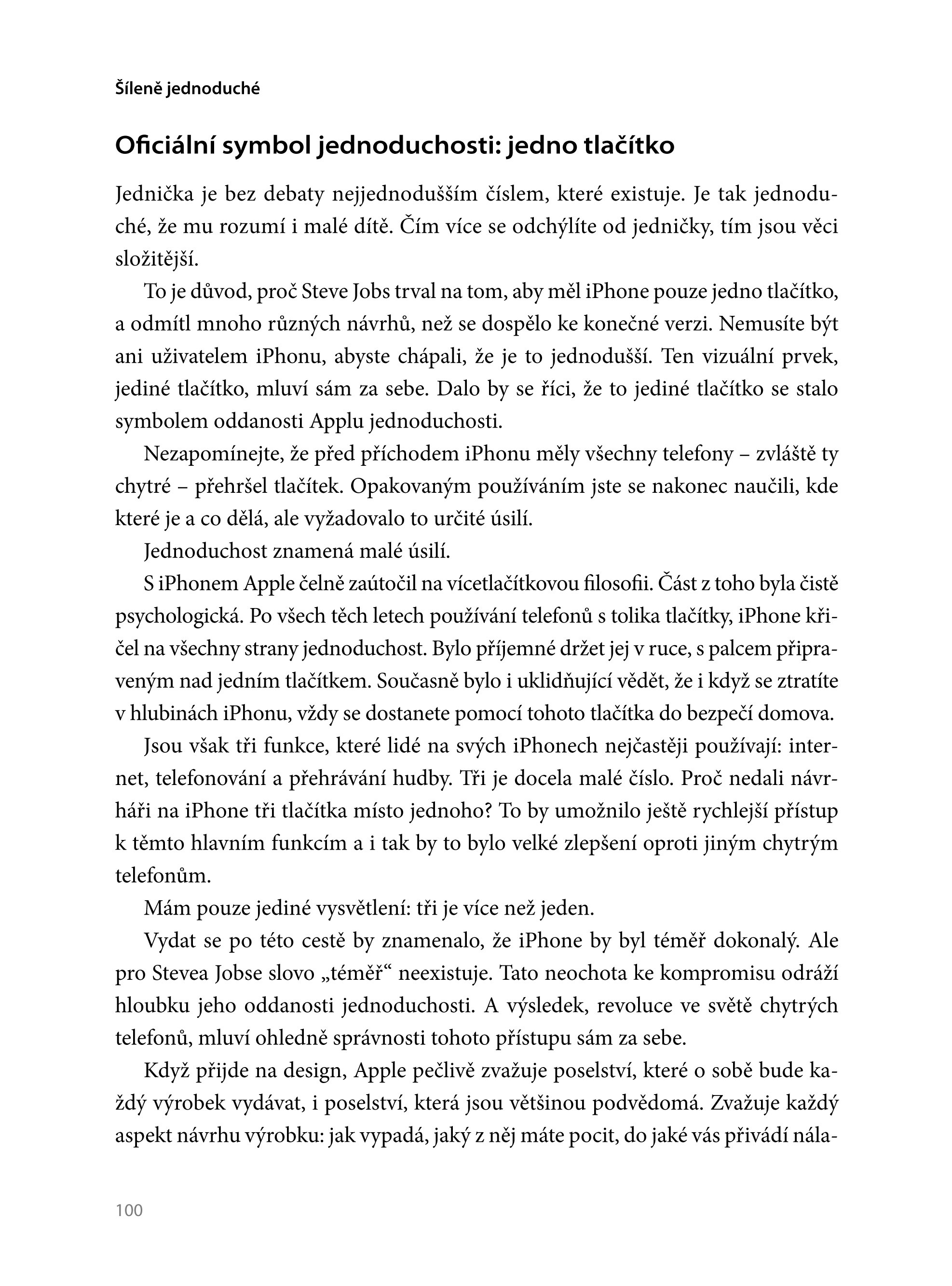 Steve Jobs dokázal, že jednoduchost je nejmocnější silou v byznysu. Nejde zdaleka jen o design výrobků, jednoduchost je přítomná na všech úrovních organizace společnosti Apple. Právě posedlost jednoduchostí odlišuje Apple od kankurence a díky ní se stala nejcennější společností na světě.