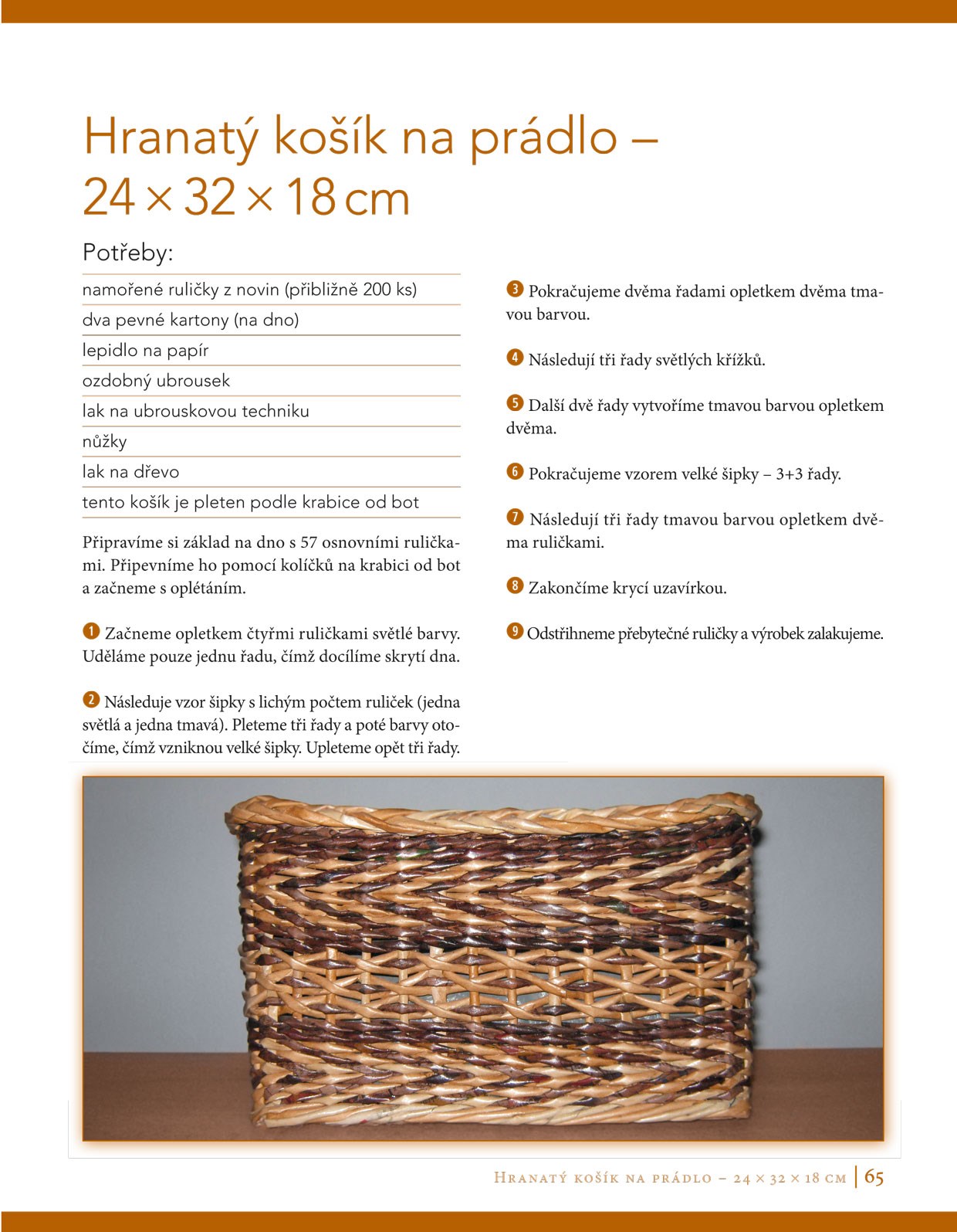 Víte, že i z obyčejného novinového papíru můžete vyrobit krásný košík, vánoční podnos či ozdobnou dekoraci? V této publikaci naleznete veškeré informace, abyste se i vy mohli pustit do tvorby z tohoto netradičního materiálu. Autorka Vás provede základními technikami pletení košíků a košíkářských předmětů a nabídne vám mnoho inspirujících nápadů v podobě svých vlastních výrobků. Dozvíte se vše potřebné pro začátek od přípravy materiálů až po jednotlivé druhy vazby, přičemž všechny postupové kroky jsou doprovázeny mnoha fotografiemi.