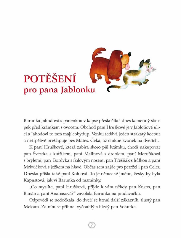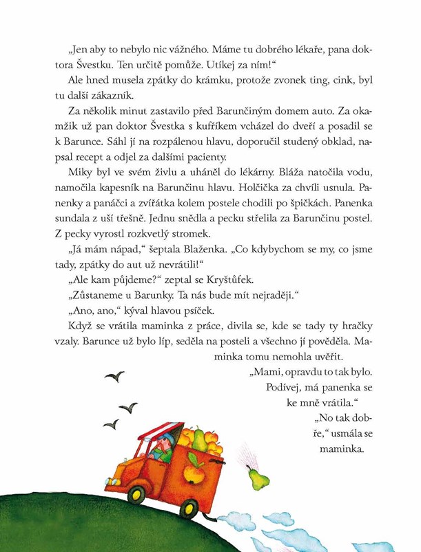 Malá Barunka ráda skáče přes sloupek s panenkou Blaženkou před domem, kde je krámek s ovocem a zeleninou. Do obchodu zboží přiváží pan Jablonka, a zrovna dneska má moc špatnou náladu. A tak mu Barunka půjčí panenku, protože Blaženka umí všechny rozveselit. Nejen že se pan Jablonka přestane hned mračit,i panenka se celou cestu raduje. Vždyť taková úžasná dobrodružství, která ji potkají na dalších vyjížďkách s ovocným autem, by doma nezažila. A nikdy by nepotkala tak úžasně zajímavé auťáky. Chcete se s nimi také seznámit? Stačí otevřít knížku!