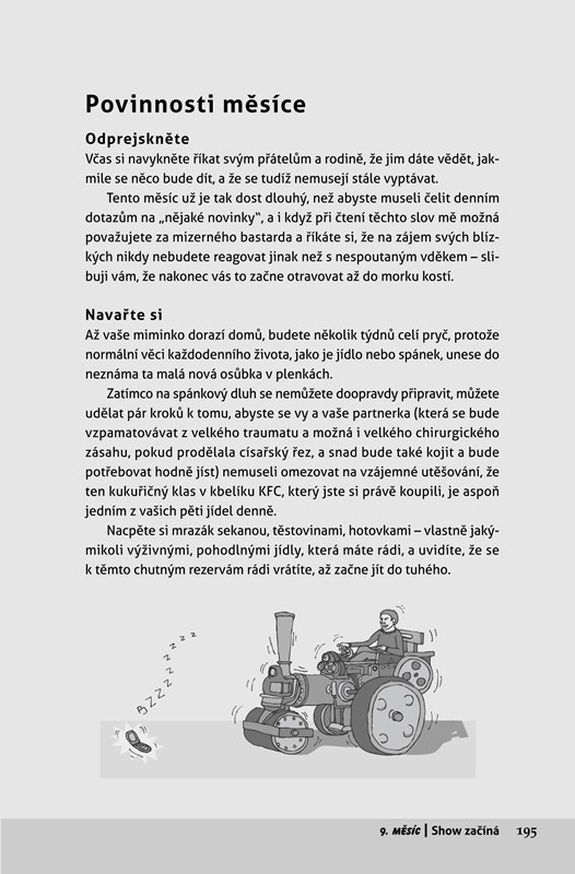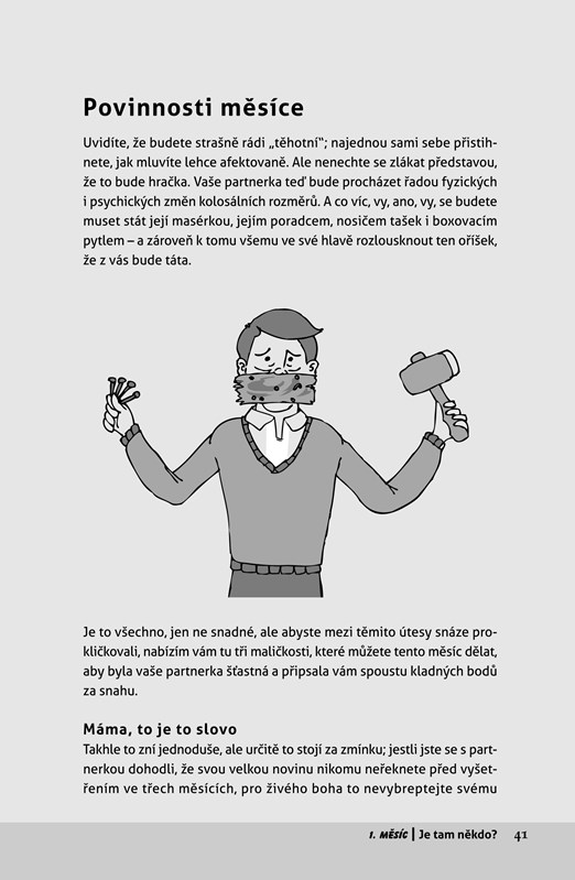 Autor, muž, který byl své ženě po dobu jejího těhotenství milujícím a pomáhajícím partnerem a u porodu byl přítomen, vás s typicky mužským nadhledem a humorem provede všemi úskalími tohoto náročného období.