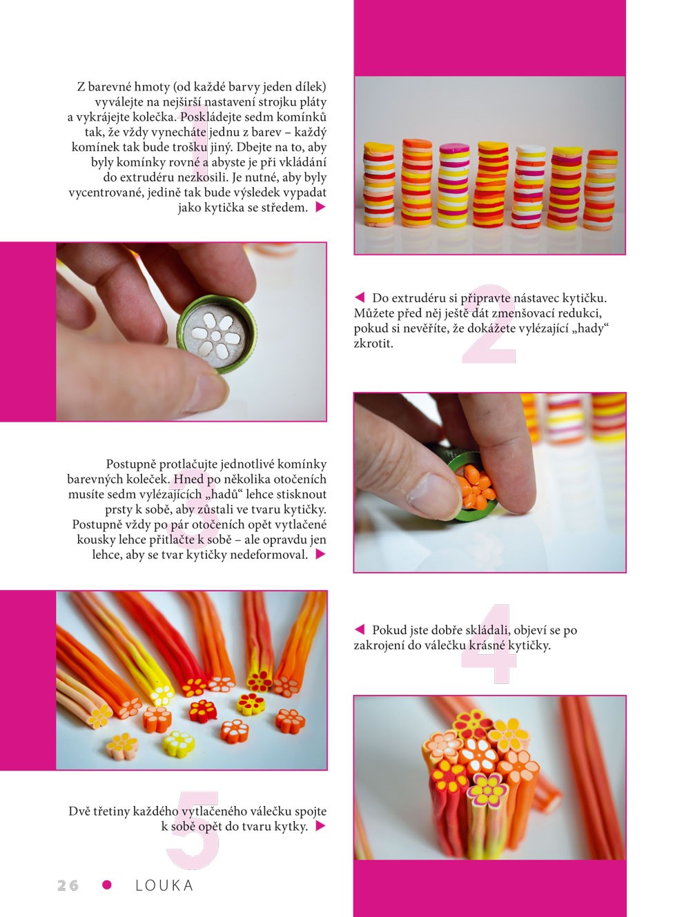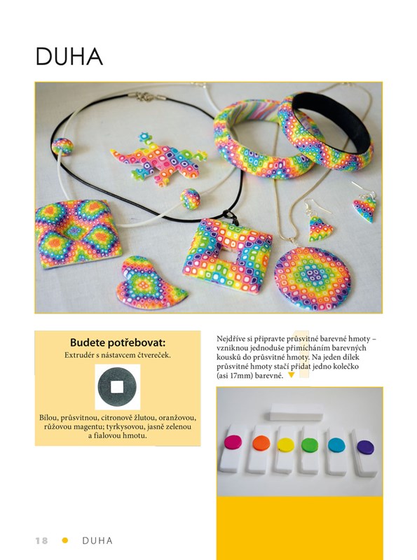 Propadli jste kouzelnému světu polymerů? Chcete vyzkoušet další projekty z dílny Moniky Brýdové? V této publikaci naleznete 25 jedinečných projektů, jejichž pojítkem je práce s extrudérem – strojkem na vytlačování hmoty, který je díky nejrůznějším výměnným nástavcům v některých technikách téměř nezastupitelný. A právě nástavce s různým průřezem umožňují efektní kombinace vzorů, jež slouží jako základ originálním výrobkům. Všechny postupy jsou opět srozumitelně vysvětleny a doplněny fotografickou přílohou, můžete se tedy bez obav pustit do Pruhovaných náramků, Ikat spirály či Dutého donutu. A nezapomeňte - nezáleží na tom, zda jste začátečník, nebo pokročilý – důležitá je chuť tvořit a vaše fantazie.