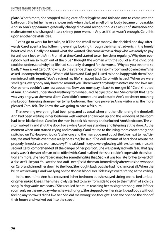 Kniha In the Name of Revenge je originální verzí a osudy osob, které prožily tyto příběhy, jsou poprvé publikovány v knižní podobě. Přestože povídky nemají právě veselý děj a končí tragicky, jistě zaujmou čtenáře, kteří čtou rádi poutavé příběhy plné emocí, jež zinscenoval sám život.