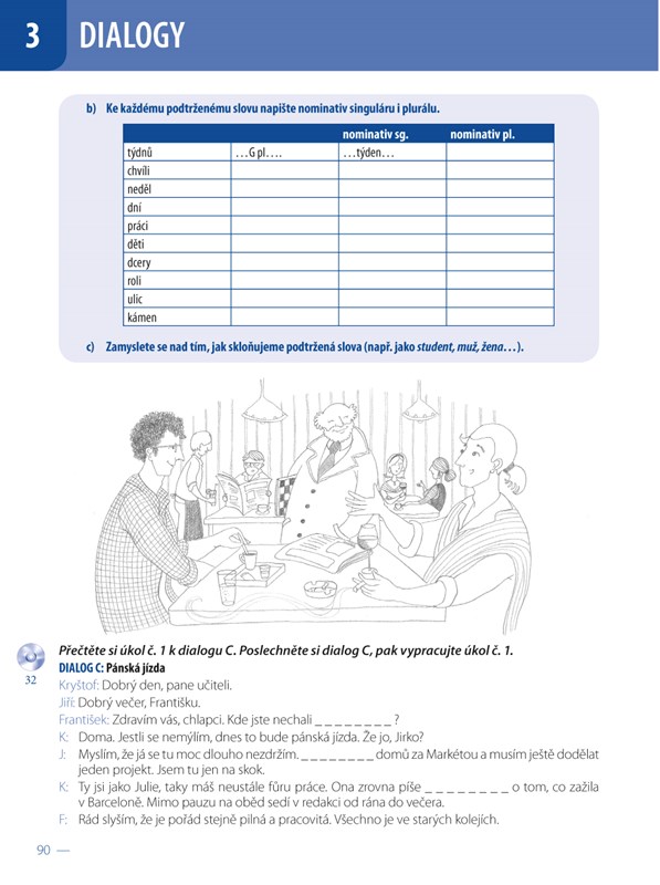 3. část DIALOGY (zde je na základě textu, ke kterému jsou vytvořeny i nahrávky, vystavěn most k výkladu gramatiky; v případě slabších skupin je tato část vhodná k průběžnému nácviku poslechu s porozuměním či čtení s porozuměním, jelikož jsou ke každému dialogu vytvořeny jak otázky k poslechu, tak ke čtení)