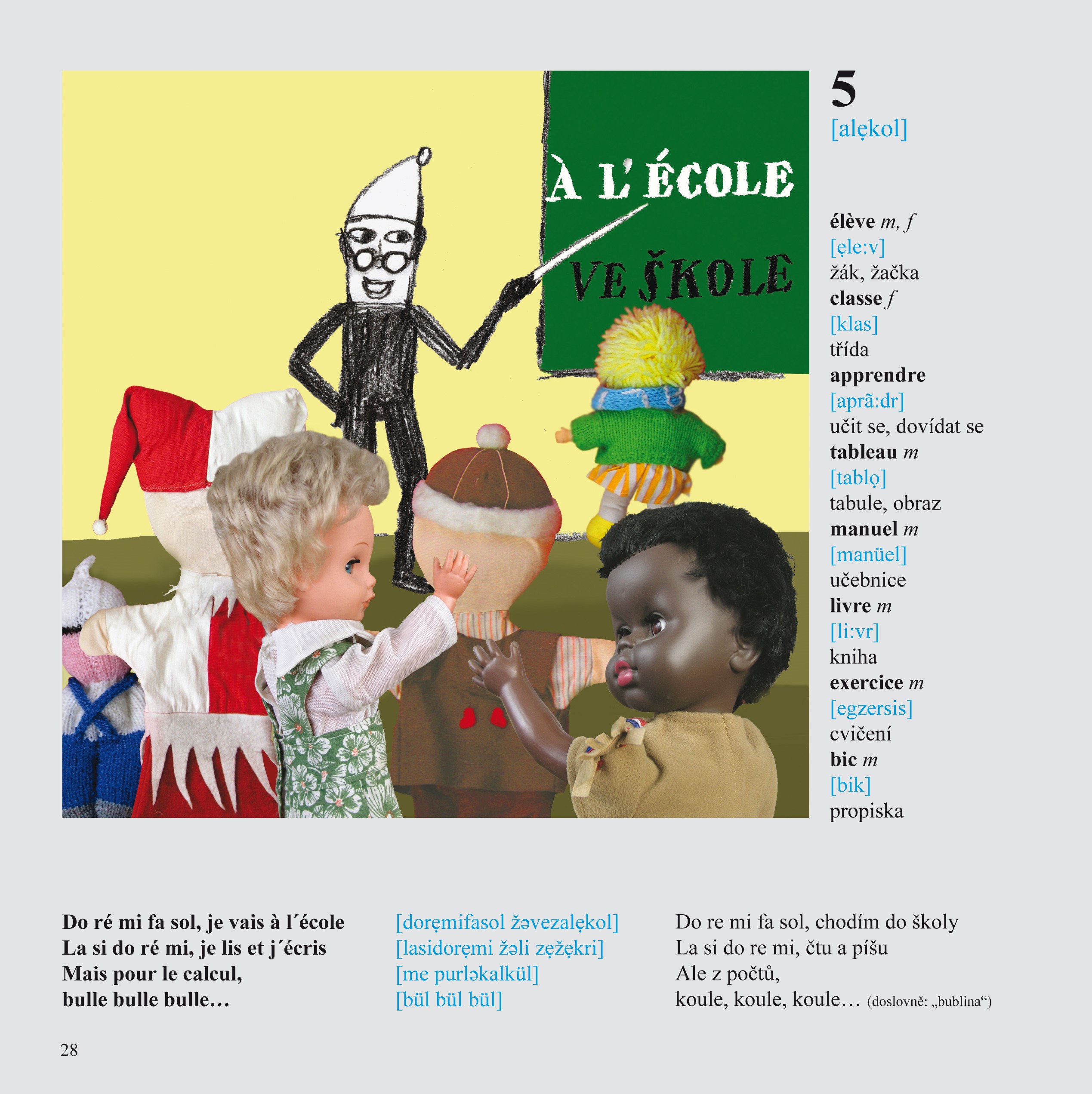 Kniha MOJE PRVNÍ FRANCOUZŠTINA si klade nesnadný cíl: nabídnout první kontakt s francouzštinou jakožto cizím jazykem mladším věkovým kategoriím studentů, probudit v nich zájem o tento krásný, leč obtížný jazyk, nenásilnou formou je provést úskalími francouzské výslovnosti a gramatiky. Učebnice je rozdělena do 35 kapitol, následuje řešení úkolů z jednotlivých lekcí. Jejich názvy kopírují dětské poznávání světa, navazování kontaktů s ním a vymezování vlastního místa v tomto světě.