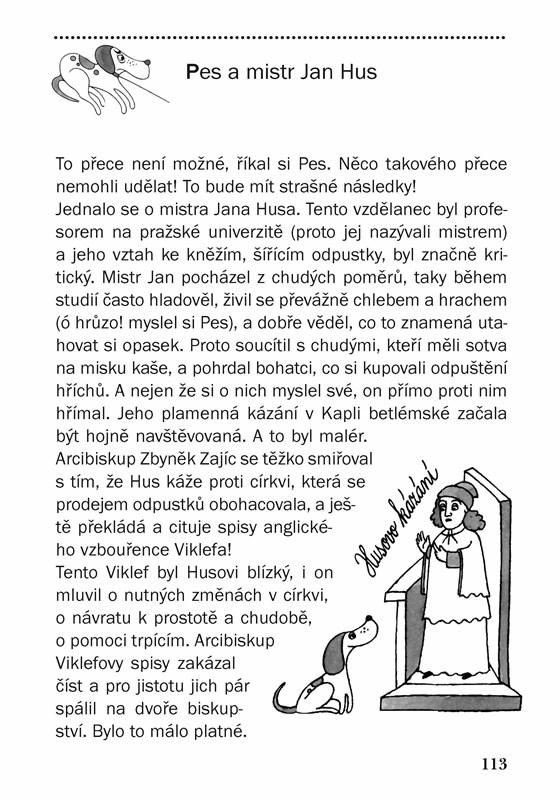 Máte rádi dějepis, zajímá vás, co se u nás v běhu času přihodilo? A chcete se o tom dozvědět trochu jinak? Pak sáhněte po knížce České dějiny očima Psa. Pes žil totiž s lidmi odjakživa, doprovázel rytíře i sedláky, procházel dějinami. Se zaujetím sledoval českou historii od praotce Čecha přes Přemyslovce, Lucemburky až k Janu Husovi. Někdy do dění přímo zasahoval, někdy ho pouze trefně komentoval. Vtipný a originální průvodce naší historií vám osvěží to, co už znáte a třeba jste trochu pozapomněli, a prozradí to, co vám zatím zůstalo utajeno. S psím kamarádem je to přece jen větší zábava!