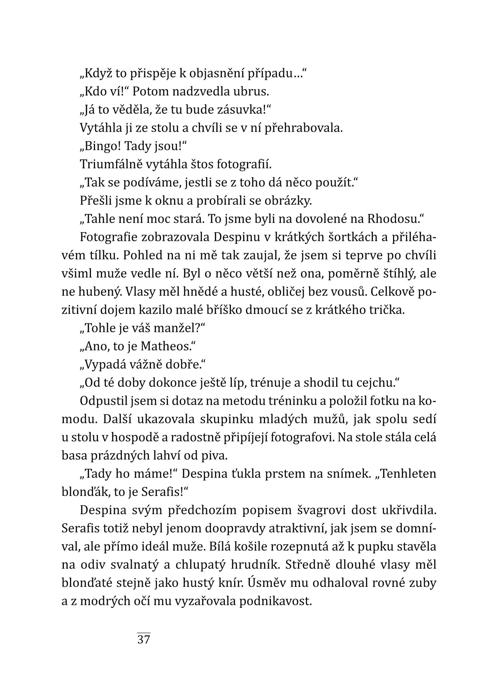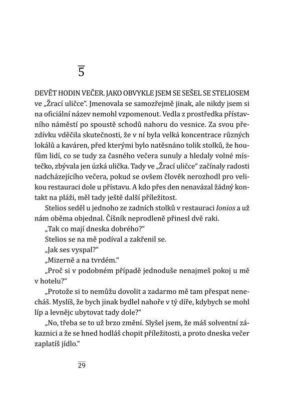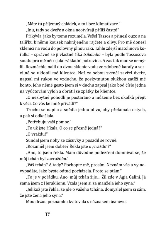 V malé kanceláři v Agia Galini se nudí soukromý detektiv Jak Anatolis. V srpnu se toho ve známém turistické letovisku moc neděje, a tak ve volném čase popíjí krétskou kořalku a žije pohodlný život, podporován přáteli. Jeho lelkování má ale skončit ve chvíli, kdy je nahoře nad městečkem nalezeno tělo. Jeden nebožtík, tři potenciální dědicové a zákeřná snacha, ale hlavně organizace skupující pozemky na jižním pobřeží – tomu všemu musí Jak čelit, když mu na stole přistane jeho první opravdový případ.