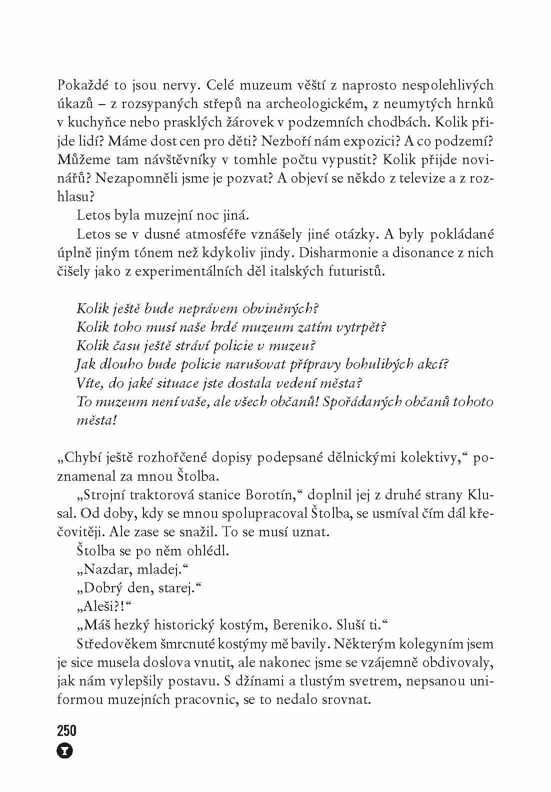 Potkali se v Táboře. Robert Štolba, bývalý policista, který být policistou nikdy tak úplně nepřestal, a Berenika Weissová, muzejní kurátorka, která se v muzeu schovává před světem i před životem.