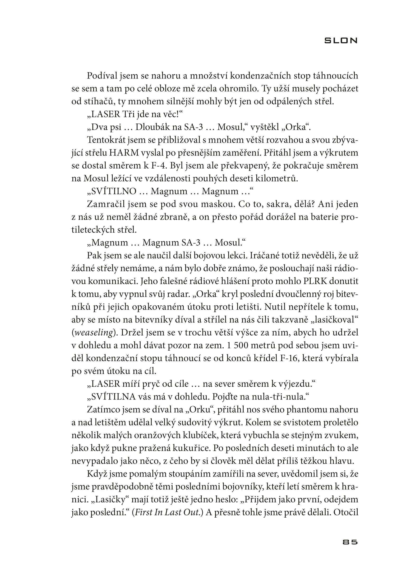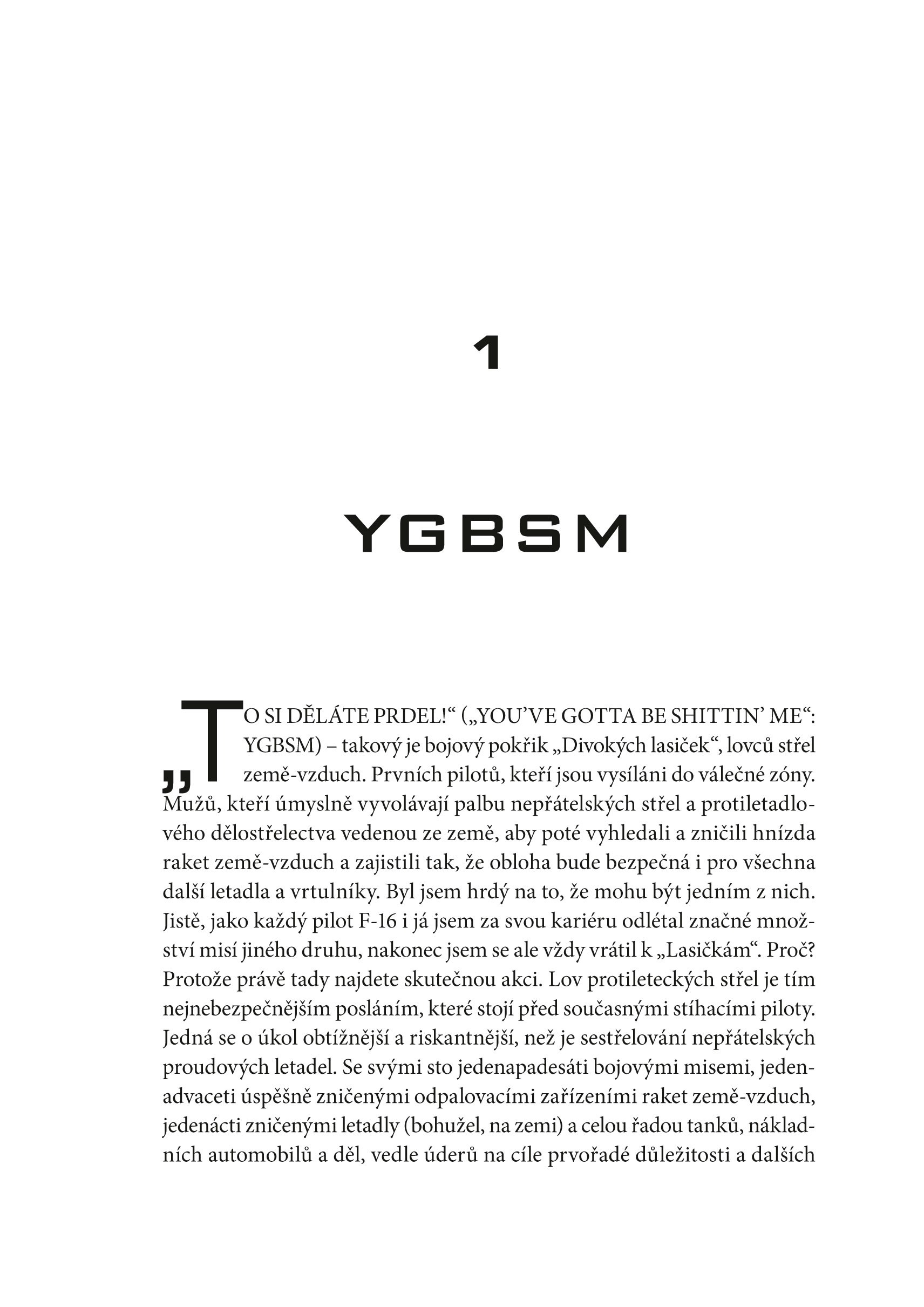 Podplukovník Dan Hampton patřil v letech 1986 až 2006 k čelným příslušníkům „Divokých lasiček“, elitních stíhacích letek USAF, jejichž bojové mise se v moderním vzdušném boji považují za nejnebezpečnější. „Lasičky“ jsou prvními letouny vyslanými do válečné zóny, létajícími hluboko za nepřátelskými liniemi, které usilují o to, aby na sebe přitáhly palbu protiletadlového dělostřelectva a střel země–vzduch. Musí se obratně vyhýbat sestřelení, načež se vrací, aby příslušné hrozby zničily a tím oblohu zabezpečily pro všechny ostatní, kdo přijdou po nich. V dnešní době jsou tyto životně důležité mise mnohem riskantnější než přímé letecké souboje s nepřátelskými letadly. Hamptonův záznam počtu útoků proti velmi významným cílům z něj dělá nejnebezpečnějšího pilota „Divokých lasiček“ na F-16 v celých amerických dějinách. Toto je jeho pozoruhodný a nevšední příběh.