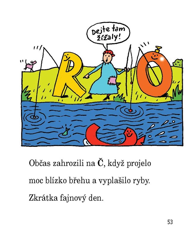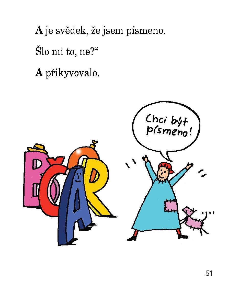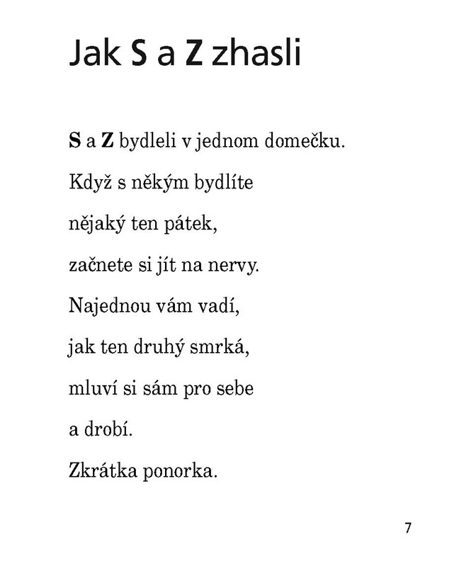 Písmenka S a Z bydlí v jednom domečku, ale někdy to mezi nimi skřípe. S se z každé povinnosti vykroutí a o kamarádovi Z říká, že by udělal lépe, kdyby si obrousil hrany. Přesto se nakonec vždycky usmíří, vždyť spoustu práce musejí dělat společně! Jednou A přivede k rybníku pana Antonína. Budou si s ním ostatní písmenka rozumět? A jak to dopadne, když se objeví strážník? Dál už ani slovo, přečtěte si to sami. Stačí otevřít knížku – je plná písmenek!