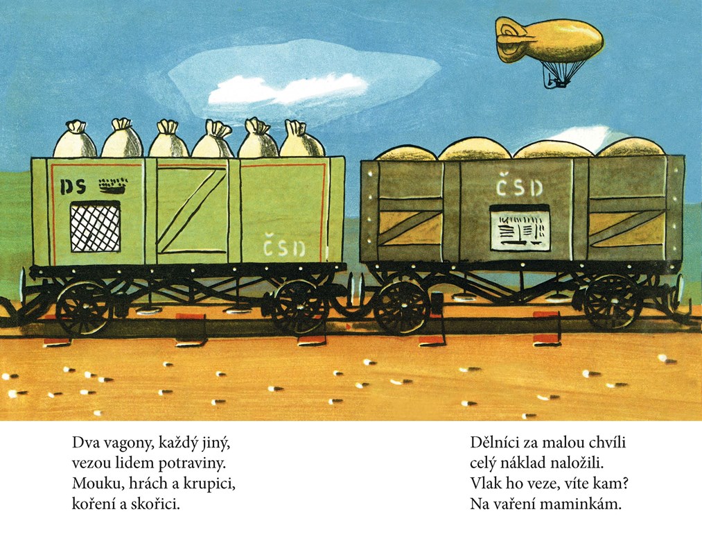 Leporelo s dlouhým nákladním vlakem Kamila Lhotáka zaujme každého malého kluka. A protože jde o vlak s parní lokomotivou, určitě zaujme i tatínky, kteří svým potomkům jistě rádi vysvětlí, že dnes už takový vlak uvidí na kolejích jen výjimečně, protože technika se od prvního vydání této knížky (rok 1954!) velmi výrazně zdokonalila a zmodernizovala. Obrázky doprovázejí verše Josefa Hiršala.