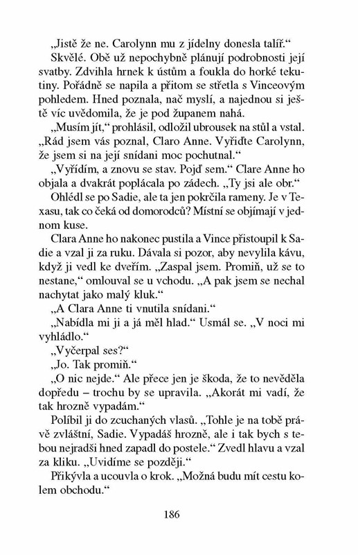 Většina obyvatel texaského Lovettu má na Sadie jasný názor: je poněkud bláznivá. Uznejte sami – nikdy nevyhrála jedinou soutěž krásy, v osmnácti bez ohlédnutí opustila Texas, rodný ranč i starého otce, nosí nemožně rovné vlasy, a hlavně, je jí třiatřicet a ještě není vdaná! Když Sadie po letech přijede do Lovettu na svatbu sestřenice, nevylepší si pověst ani tím, že si na oslavu pozve úplně cizího muže, bývalého námořníka Vince Havena. Sadie má v plánu svatbu přetrpět a ihned z Texasu zase zmizet. Osud jí však udělá čáru přes rozpočet a ona musí v Lovettu neplánovaně zůstat. Žhavý románek s Vincem se postupem času mění v cosi vážnějšího, to by si ale na začátku nesměli slíbit, že se rozhodně vázat nebudou…