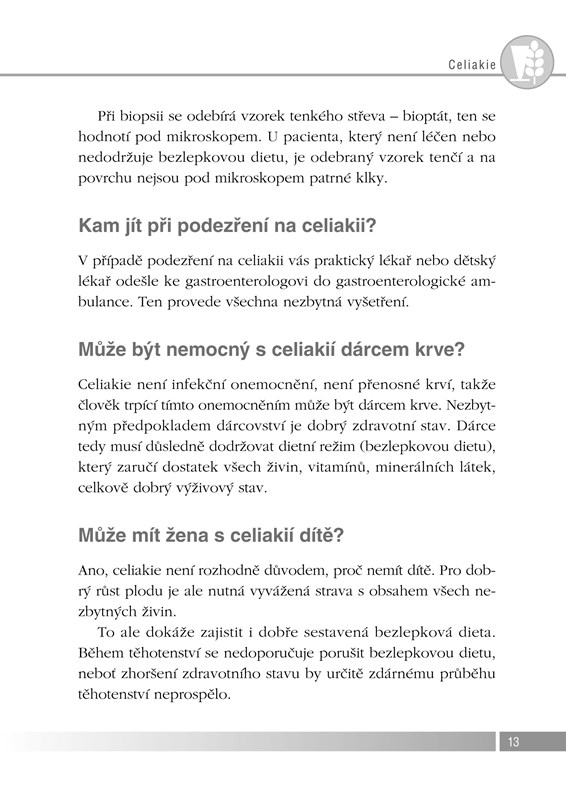 Jak poznat první příznaky? Jaké vyšetřovací metody se používají a jak probíhají? Které potraviny jsou dovoleny, které zakázány a které jsou naopak velmi vhodné? Může mít žena trpící celiakií děti? Budu se moci stravovat mimo domov? Je možné, aby celiakie propukla až v dospělosti? Jaká úprava potravin je v případě bezlepkové diety nejvhodnější? Existuje rozdíl mezi potravinovou alergií a celiakií? Podle čeho poznám bezlepkové nebo bezmléčné potraviny v cizině?