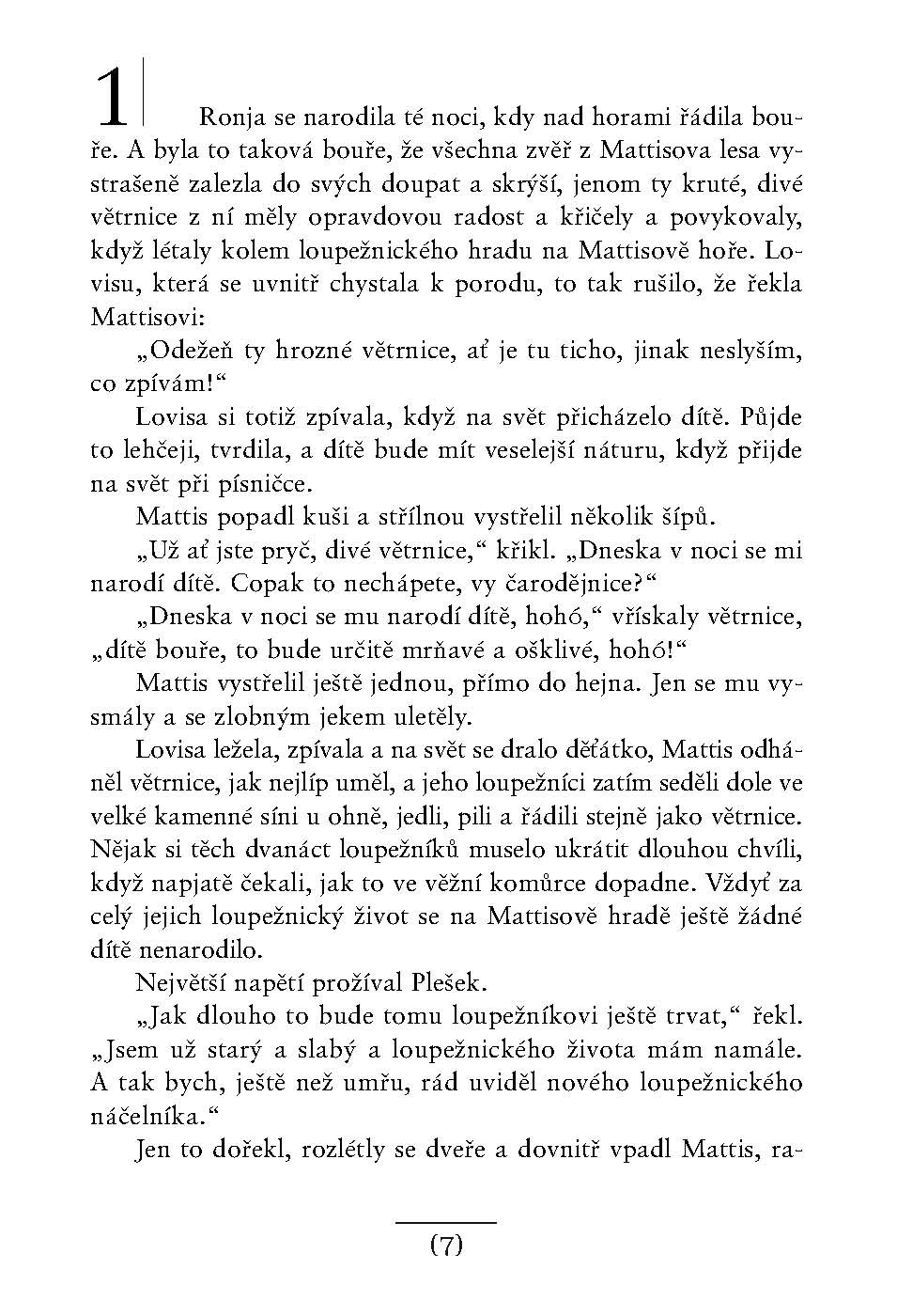 Za bouřlivé noci, která byla tak děsuplná, že vedví rozťala prastarý hrad, se narodila Ronja, dcera loupežníka, hradního vládce. Odtrženou část hned obsadil na smrt znepřátelený rod lupiče Borky. A co čert nechtěl, Borkův syn Birk se brzy spřátelil právě s Ronjou. Co všechno poté následovalo a co spolu prožili, prozrazuje toto vyprávění z dávných dob. Příběh, který se odehrává v panenské přírodě a v divokém lese, obývaném zvěří, nelítostnými větrnicemi, bludičkami, skřítky šedivíky a čumbrky, budete číst s napětím i obavami, smíchem i s nadějí, že se snad oběma dětem podaří smířit dva staré znesvářené klany.