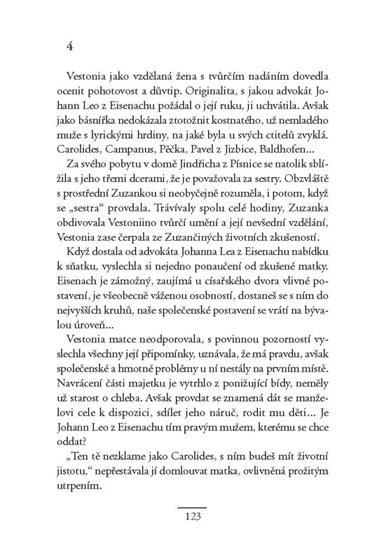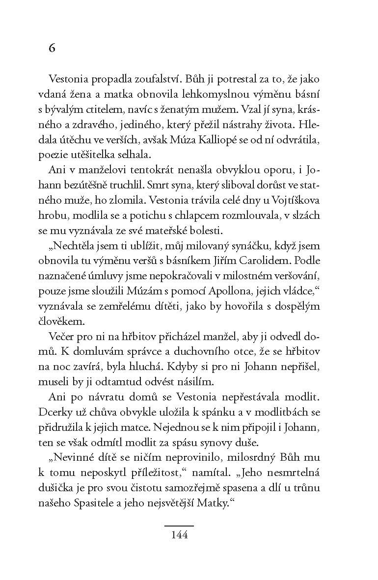 Elisabeth Westonová, známá jako Vestonia, se narodila v Anglii, ale většinu svého života strávila v rudolfínské Praze, kam přišla se svým nevlastním otcem, slavným alchymistou Edwardem Kelleym. Spolu s ním pak zažila vzestupy a pády, podle toho, zda se Kelley zrovna těšil přízni vladaře, nebo byl v nemilosti. Již od dětství se u ní projevovalo výrazné básnické nadání, které se rozvinulo zejména po Kelleyho smrti. Její latinsky psané básně vycházely nejen v Čechách, ale i za hranicemi, jejími přáteli byli významní humanističtí básníci po celé Evropě. Její verše zaujaly i císaře Rudolfa. Byla nazývána desátou Múzou, čtvrtou Grácií, divem světa, ženským Ovidiem, nejučenější ženou století. Jen v lásce se jí štěstí vyhýbalo, básník Carolides, do něhož se zamilovala již jako malá holčička, se oženil s jinou. Přesto však Vestonia nakonec rodinné štěstí našla…