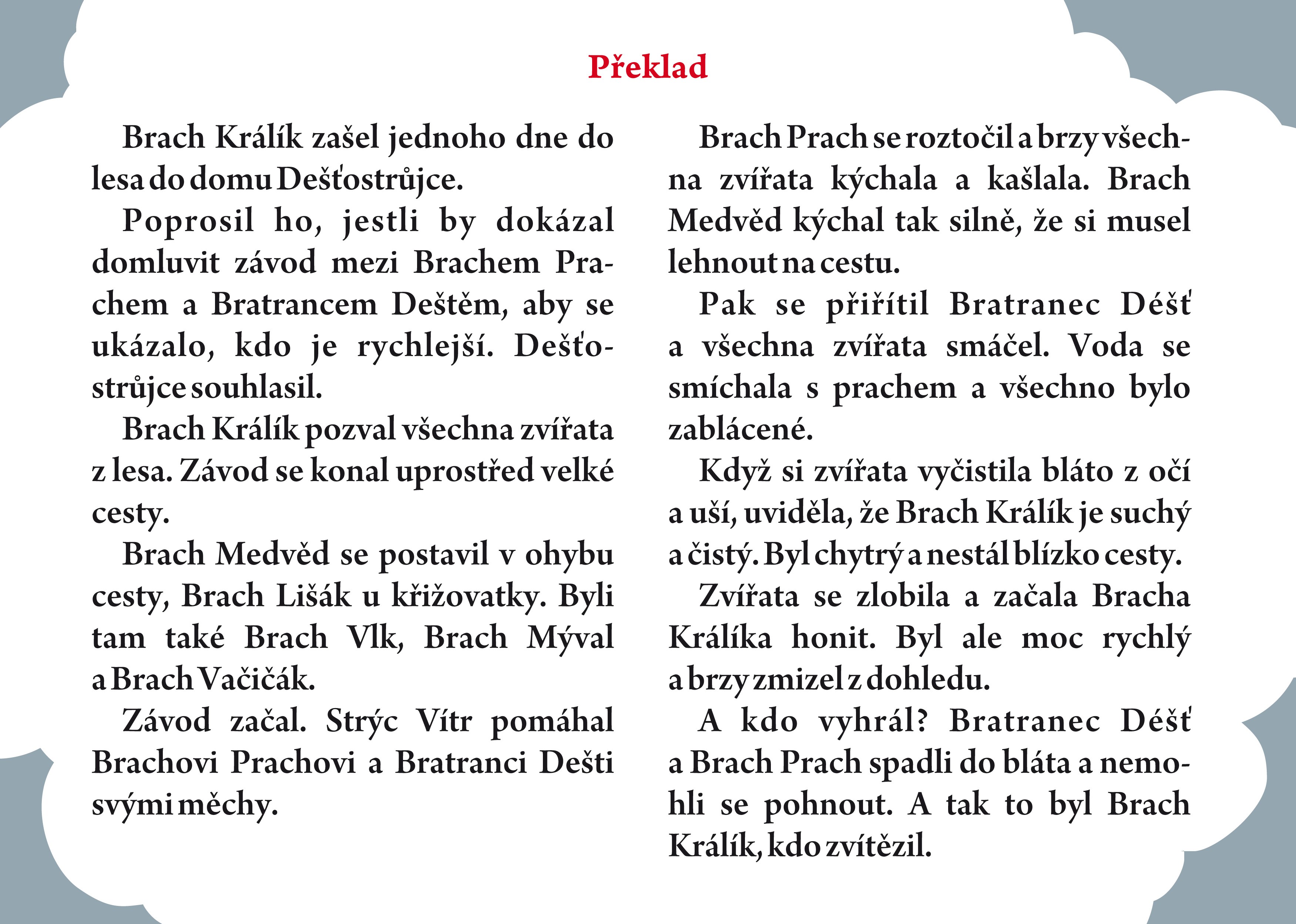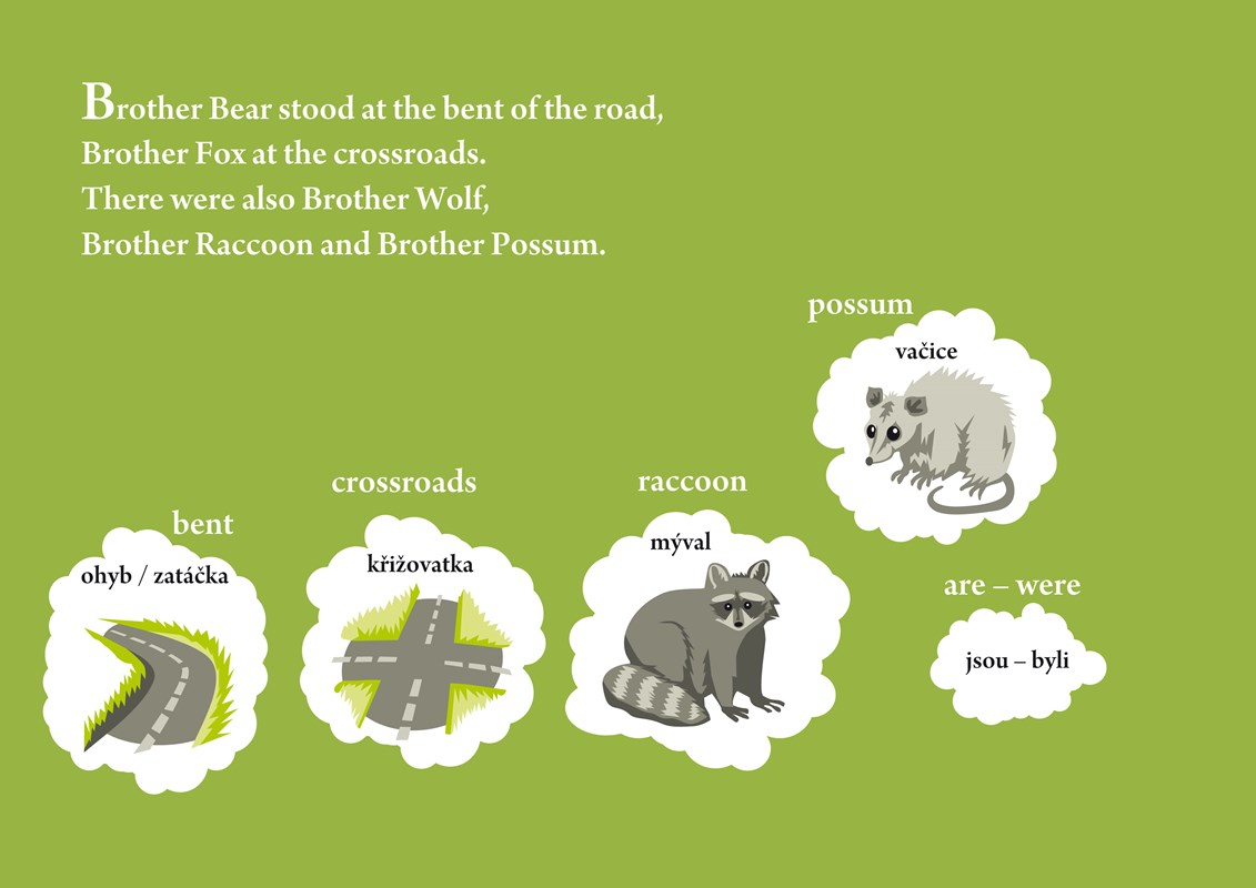 My jsme kvůli zjednodušení strýčka Remuse vynechali a jeden z příběhů převyprávěli moderní jednoduchou angličtinou, které jsou schopné porozumět děti po 2 – 3 letech studia anglického jazyka. Kromě vysvětlení klíčových slovíček přímo v textu si čtenáři mohou přečíst překlad uvedený na konci knihy. Vzadu v knize čtenáři najdou také několik úkolů, které procvičují a dále rozvíjejí slovní zásobu, gramatiku a porozumění textu.