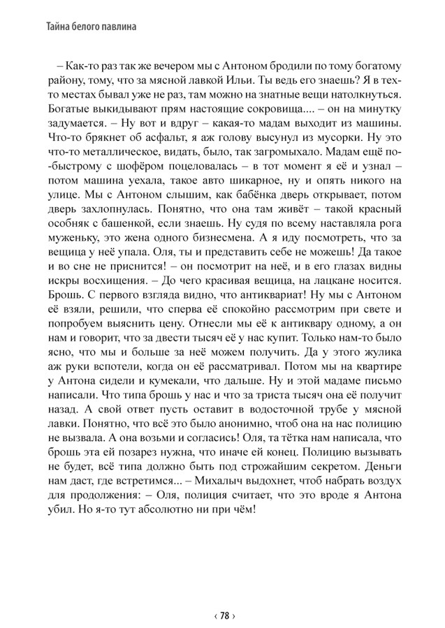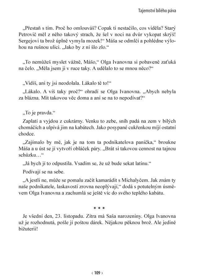 Dvojjazyčná detektivka je určena nadšencům, kteří nepřestávají hledat a objevovat nová zákoutí ruštiny a volí i alternativní cesty, jak se v daném jazyce zdokonalit. Zavede je do prostředí ruského maloměsta, kde by se na první pohled mohlo zdát, že se zastavil čas. Pravdou však je, že tam, kde žijí lidé, odehrávají se vždy příběhy šťastných i nešťastných konců…