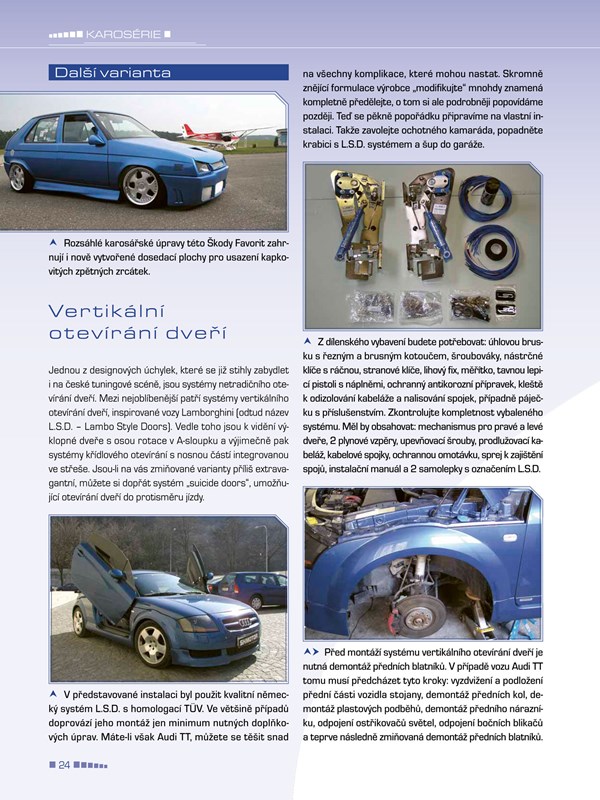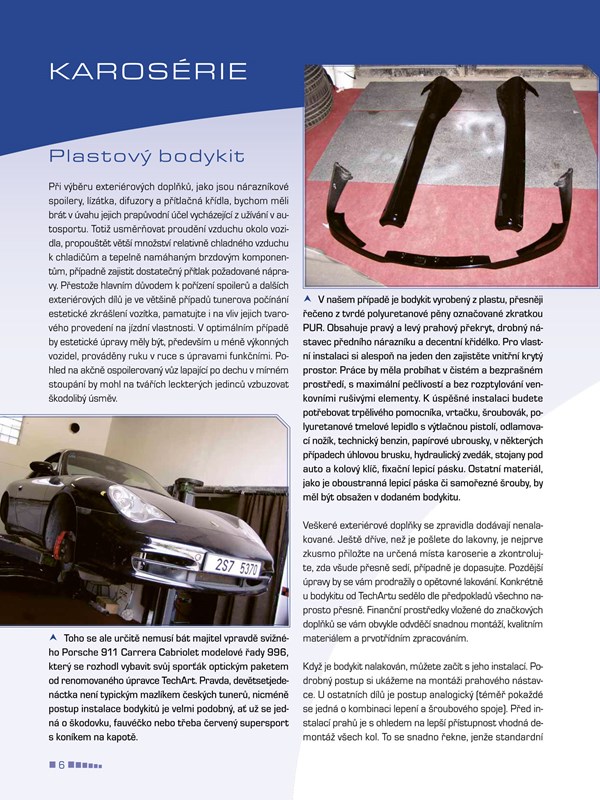 Uváděné postupy tuningových úprav jsou obecně platné, můžete je vnímat jako dokonalý receptář, jak si upravit vůz podle svých představ, a to ve většině případů svépomocí. Všechny postupy jsou doprovázeny bohatou fotografickou přílohou, dozvíte se o výhodách provedených úprav a samozřejmě vám popíšeme i vybavení, jaké budete pro vybrané úpravy potřebovat. V doplňujících panelech se dozvíte něco