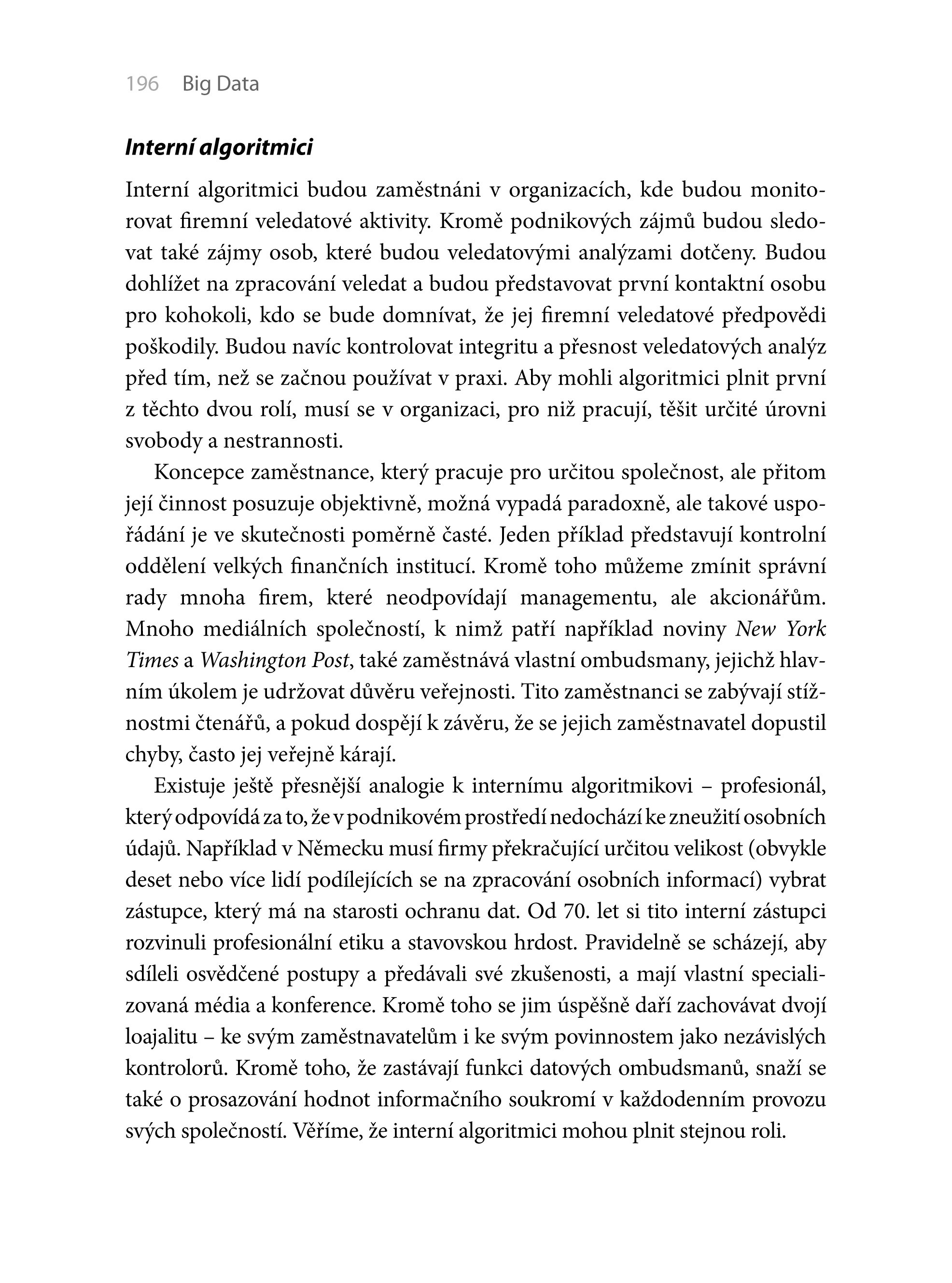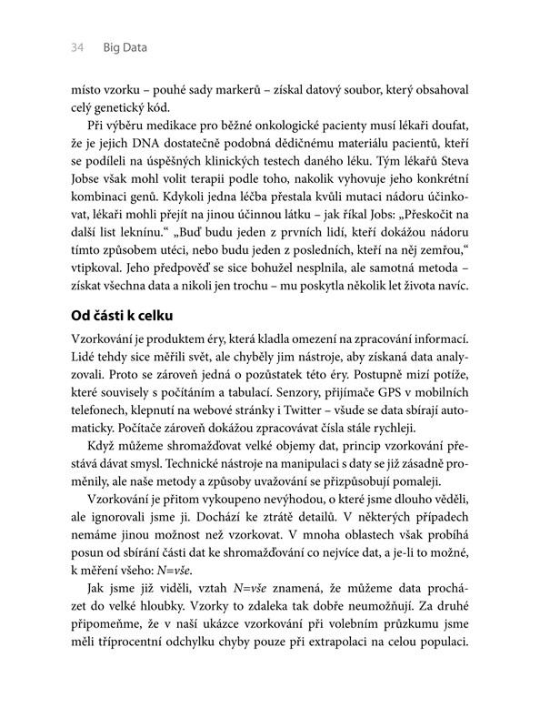 Dvojice autorů vám ukáže moderní přístup ke zpracování dat, který nepracuje se vzorkem, ale celou množinou. Takto lze získat cenné informace mnohem rychleji než v případě konvenčních postupů a v řadě případů lze objevit i úplně nové spojitosti. S novými možnostmi zpracování dat se seznámíte poutavou čtivou formou, autoři je popisují na příkladech z běžného života, na známých společnostech, zcela bez komplikovaných, těžko srozumitelných technických popisů.