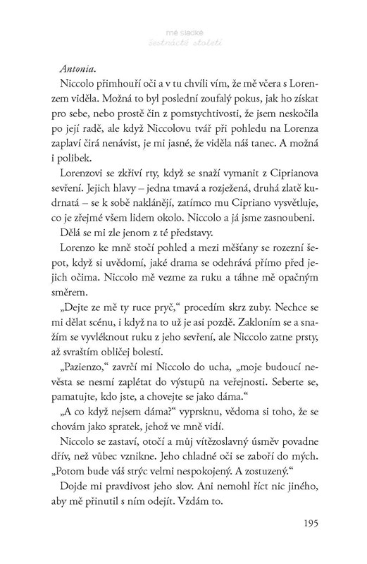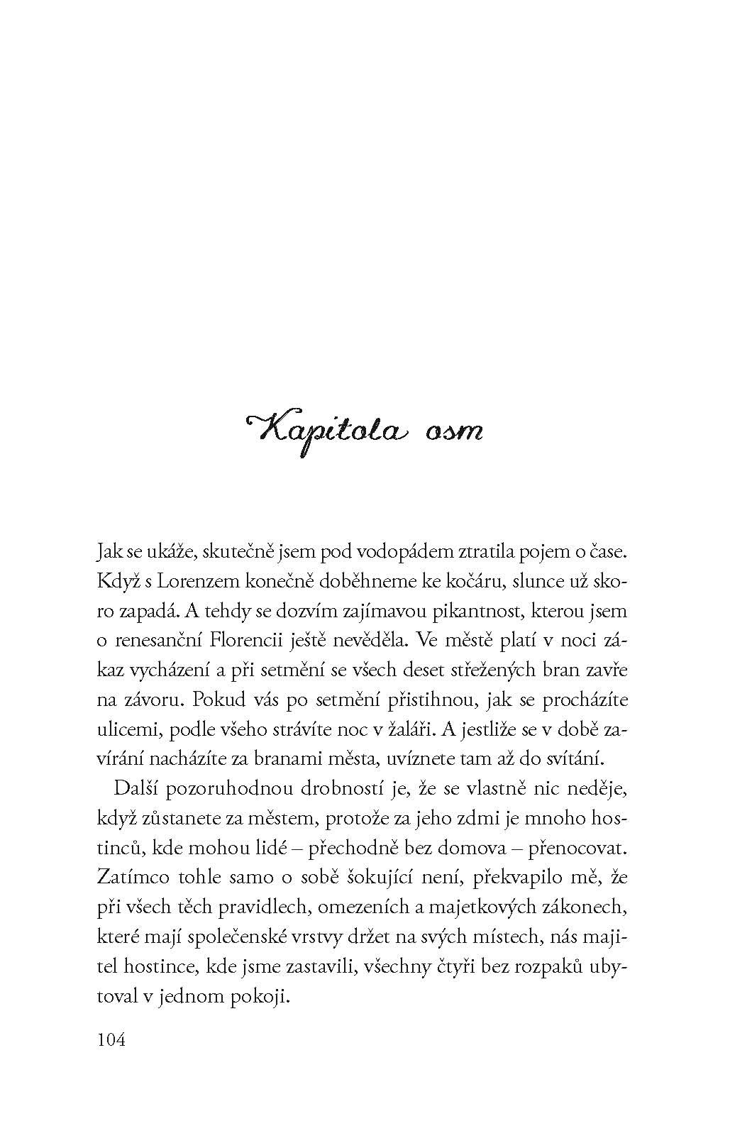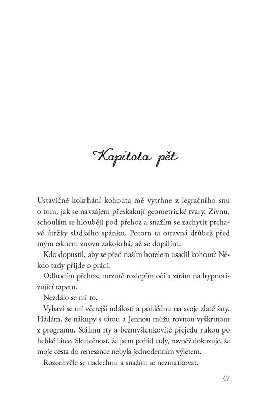 Cat Crawfordová má za pár dní oslavit své sladké šestnácté narozeniny. Ovšem to poslední, co si Cat přeje, je extravagantní narozeninová party organizovaná její temperamentní nevlastní matkou. Alespoň malou útěchou jí je plánovaný rodinný výlet do magické Florencie. A když ji při prohlídce tohoto úžasného města zavede zvědavost do cikánského stanu, ocitne se přímo… v renesanční Florencii.