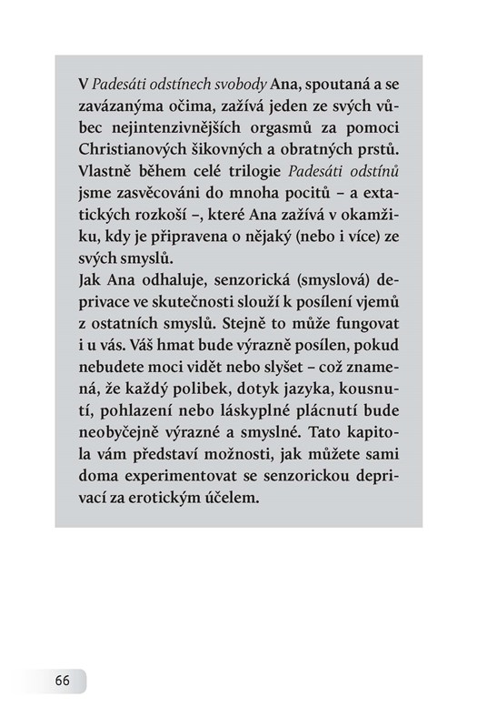 Zatoužili jste po přečtení trilogie Fifty Shades po podobném vzrušení? Napadlo vás vyzkoušet si, co si v knize Christian a Ana tolik užívají, i ve své vlastní ložnici? Tato kniha vám přináší jednoduchý návod, jak prožívat vášeň ve stylu Padesáti odstínů.