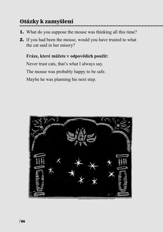 Kromě zamyšlení nad příběhem samotným jsme otázky v textu využili ke zdokonalení aktivní znalosti angličtiny. Ke každé otázce vám nabídneme možné fráze a slovní zásobu, které můžete při zodpovídání otázky použít. Jak s nimi dále naložíte, to už je na vás. Jednoznačná správná odpověď na otázky neexistuje, možností je spousta. Dále jsme v každé kapitole vybrali jazykové jevy, ke kterým za kapitolou najdete komentář. Zda jste správně porozuměli anglickému textu, si můžete zkontrolovat v zrcadlovém českém překladu. Na konci knihy je uvedený základní přehled anglické gramatiky. Anglický text si také můžete poslechnout na přiloženém
