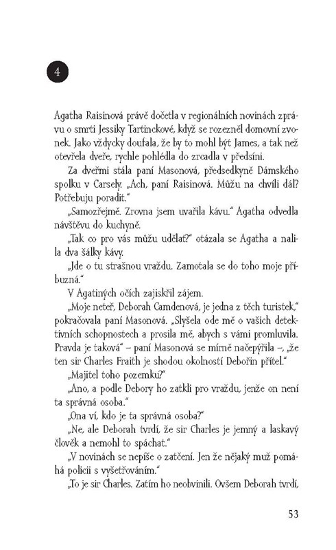 Po půlroce stráveném v Londýně se Agatha Raisinová vrací do své milované cotswoldské vesničky a do sousedské blízkosti fešného Jamese Laceyho. Zdá se ale, že Jamese jejich opětovné shledání nechává chladným. Agathu tak brzy pohltí její druhá vášeň: vyšetřování zločinů. V opuštěném poli je nalezena mrtvá žena – Jessica Tartincková, předsedkyně klubu turistů, která doháněla majitele pozemků k nepříčetnosti tím, že trvala na právu výletníků procházet přes jejich půdu. Teď je na Agatě, aby zahájila pátrání...