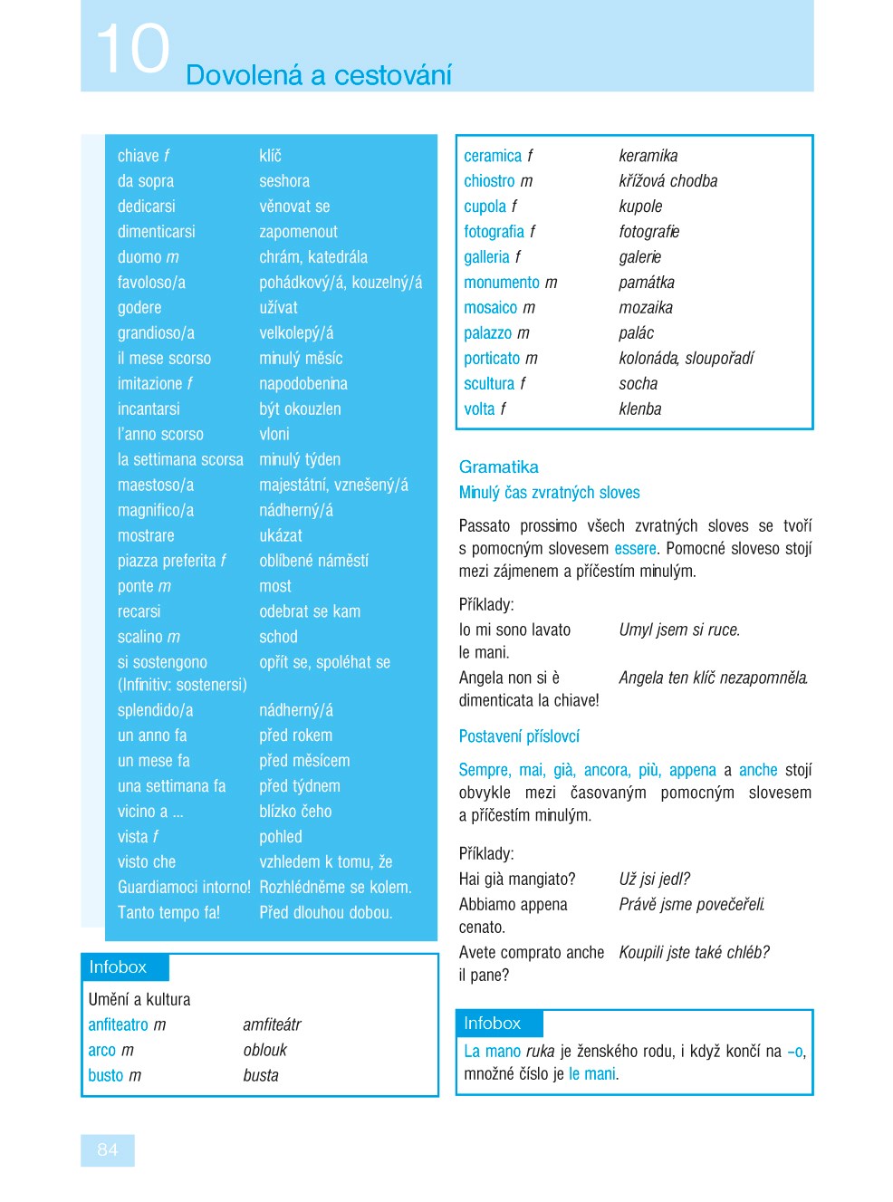 Ve 24 lekcích se naučíte základní gramatiku a osvojíte si slovní zásobu potřebnou v běžné komunikaci. Díky rozmanitým textům přibližujícím obvyklé situace (na nádraží, v hotelu, na nákupu, u lékaře, v bance, s přáteli) budete vědět, jak v dané chvíli reagovat. V infoboxech pak budete průběžně seznamováni s jazykovými zvláštnostmi, místními reáliemi a způsobem života v Itálii. Samozřejmostí jsou také rozmanitá cvičení, díky kterým si lehce zopakujete to, co jste se již naučili.