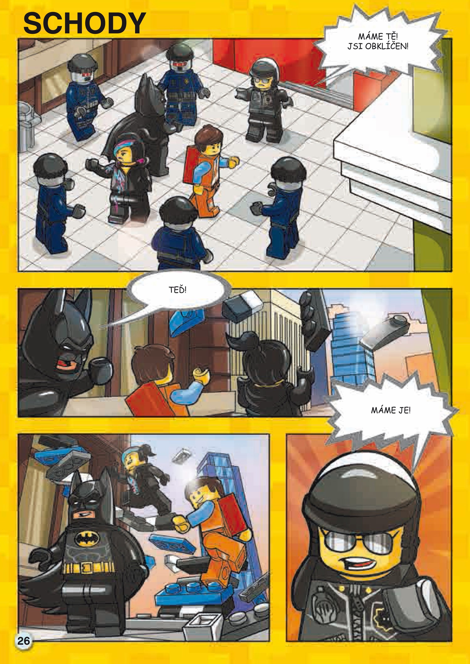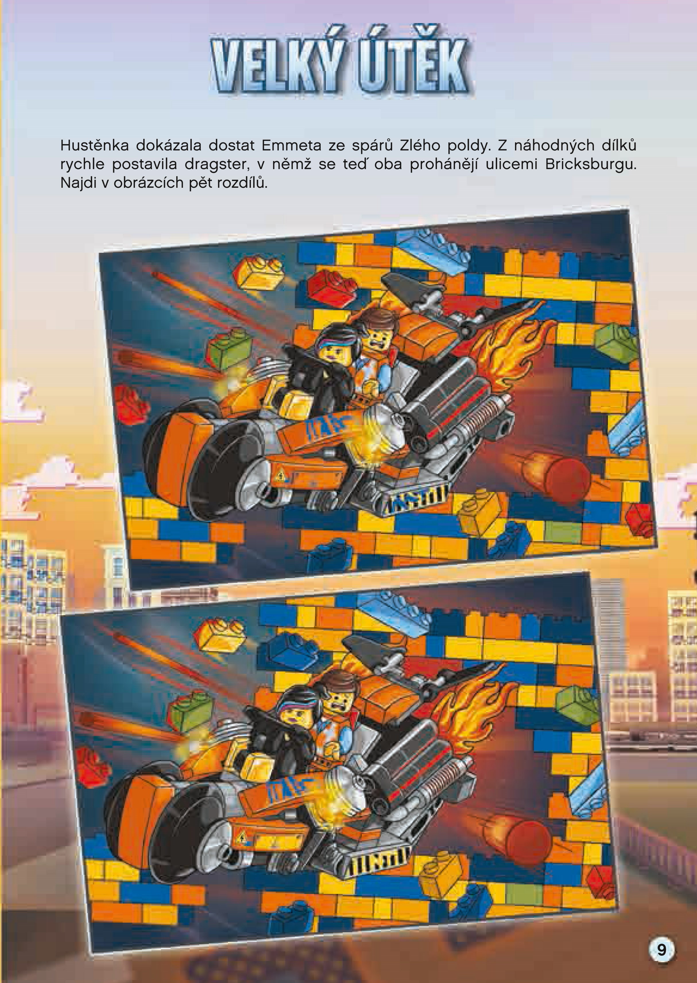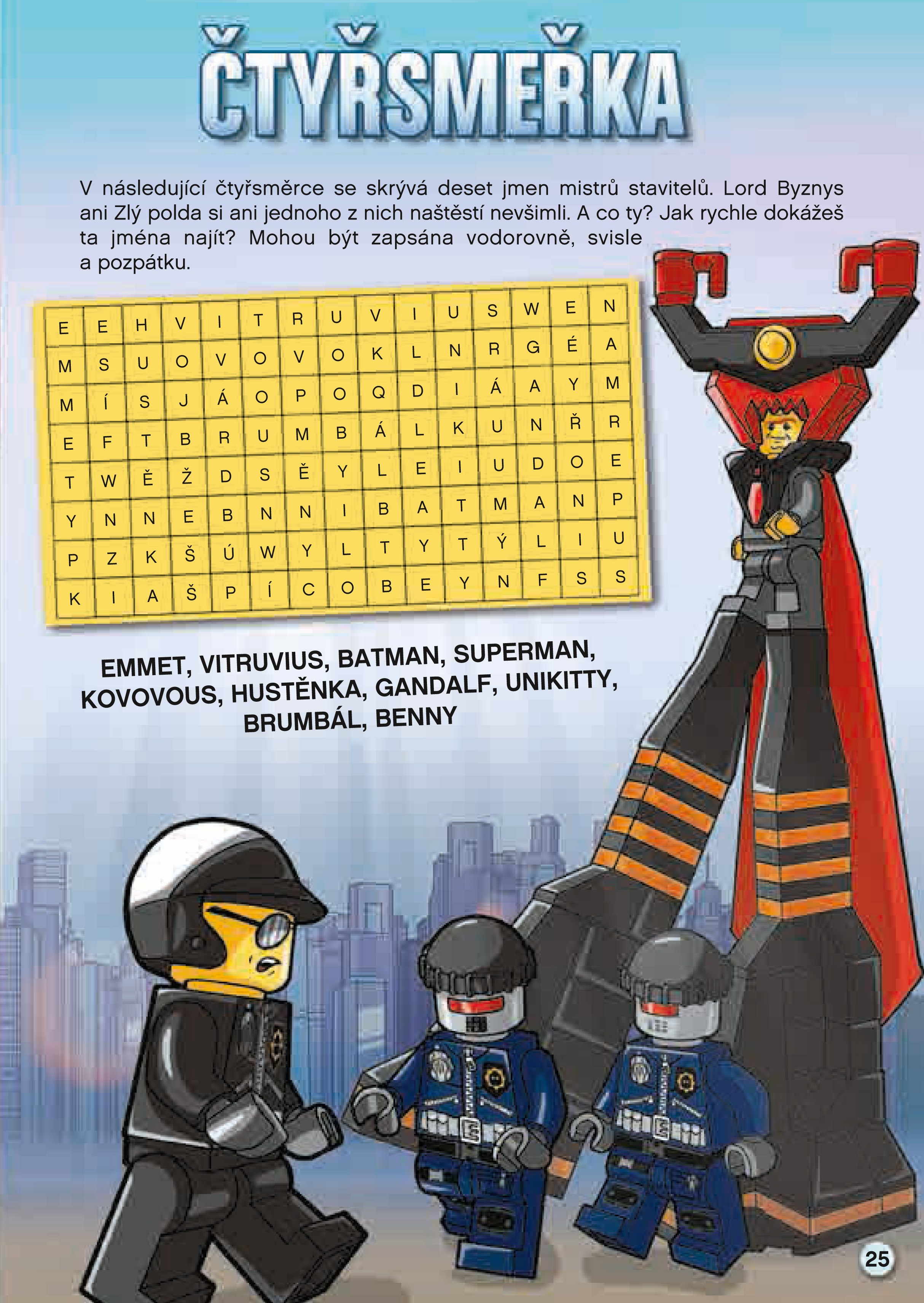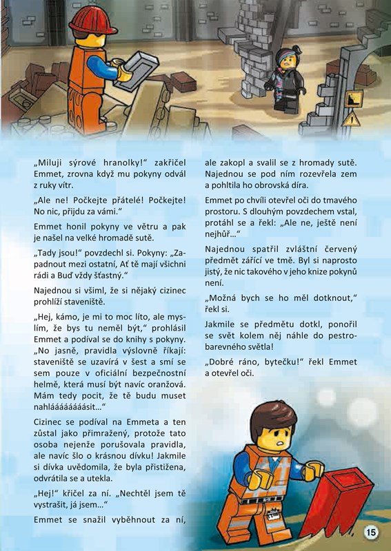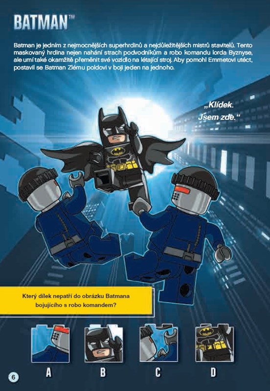 V této publikaci oficiálně schválené společností LEGO Group najdete kromě krátkého příběhu i spoustu zábavných aktivit: hledání v obrázcích, otázky a odpovědi, bludiště, čtyřsměrku nebo kvízy. Setkáte se v ní s mnoha postavami z filmu: Emmetem, Vitruviusem, Batmanovou přítelkyní Hustěnkou, princeznou UniKitty či Kovovousem.