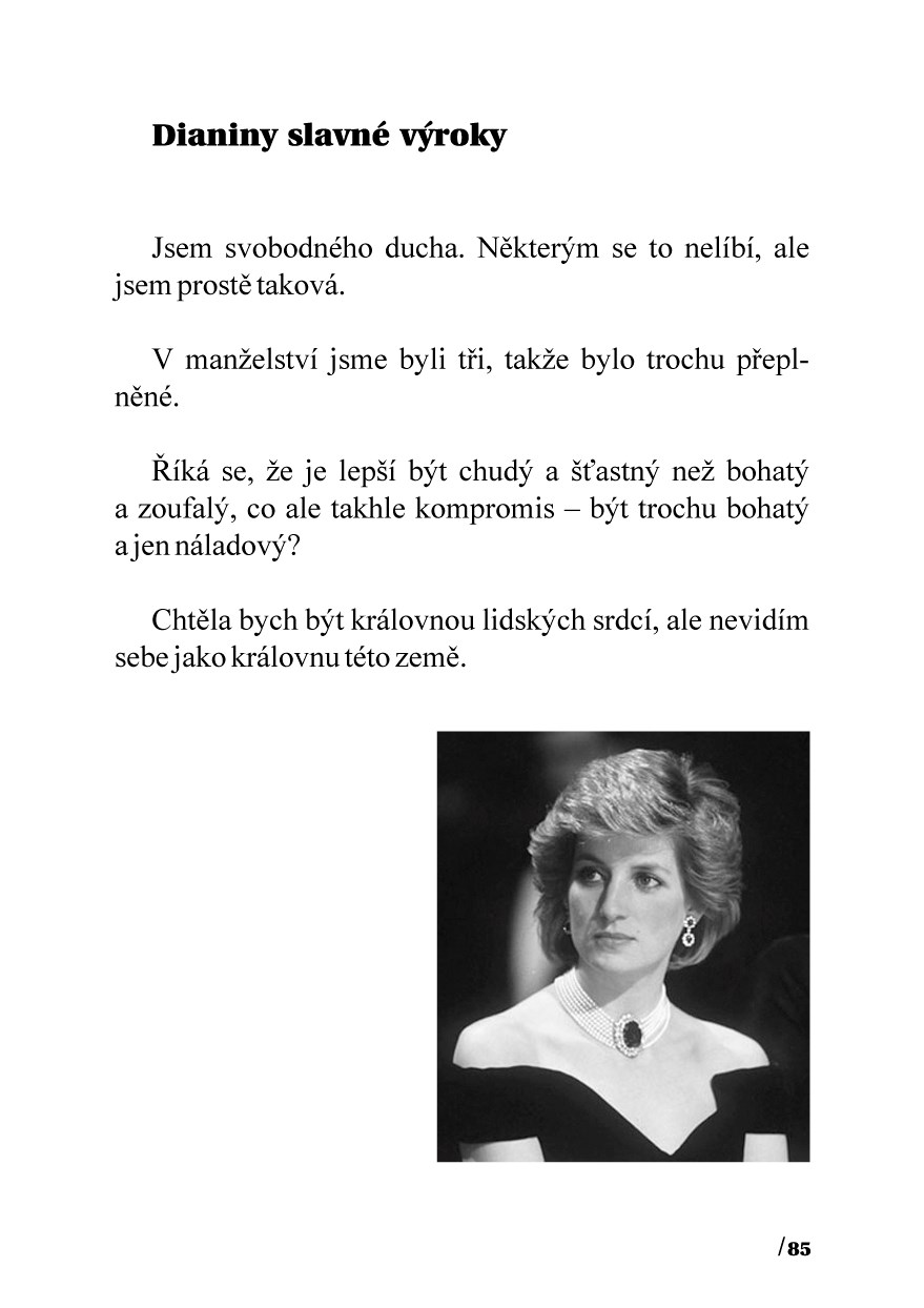 Lady Spencerovou, pozdější princeznu z Walesu, znají všichni především jako princeznu Dianu, i když je vlastně tento titul nesprávný. Napsáno toho o ní bylo mnoho, a nejspíš už se nikdy nedozvíme, jak se některé události v jejím krátkém životě skutečně odehrály.