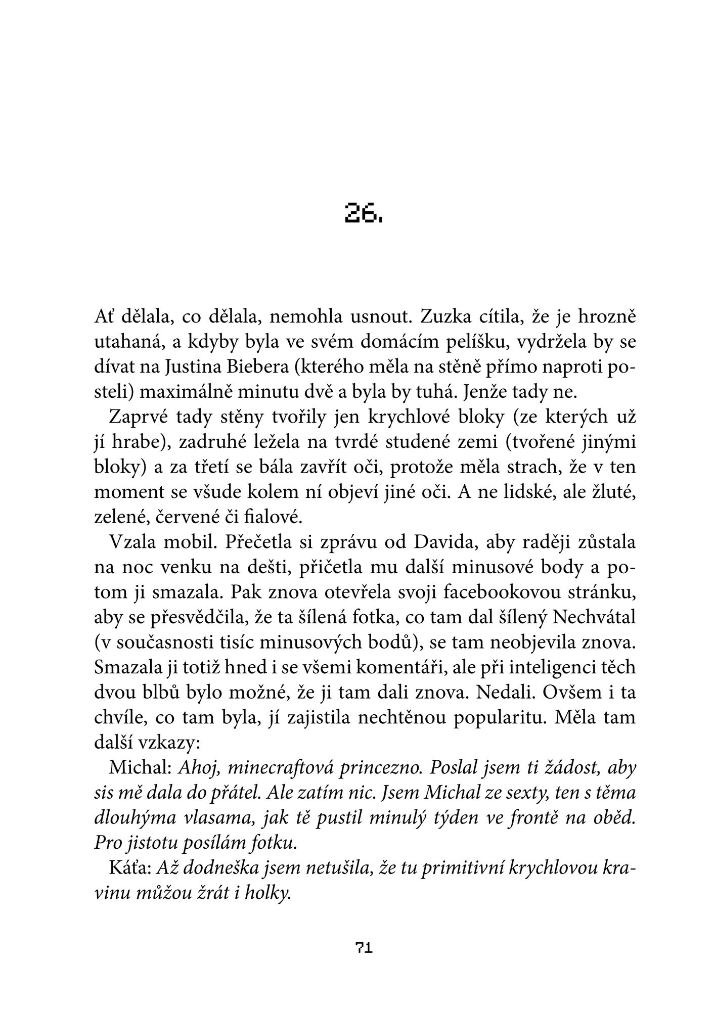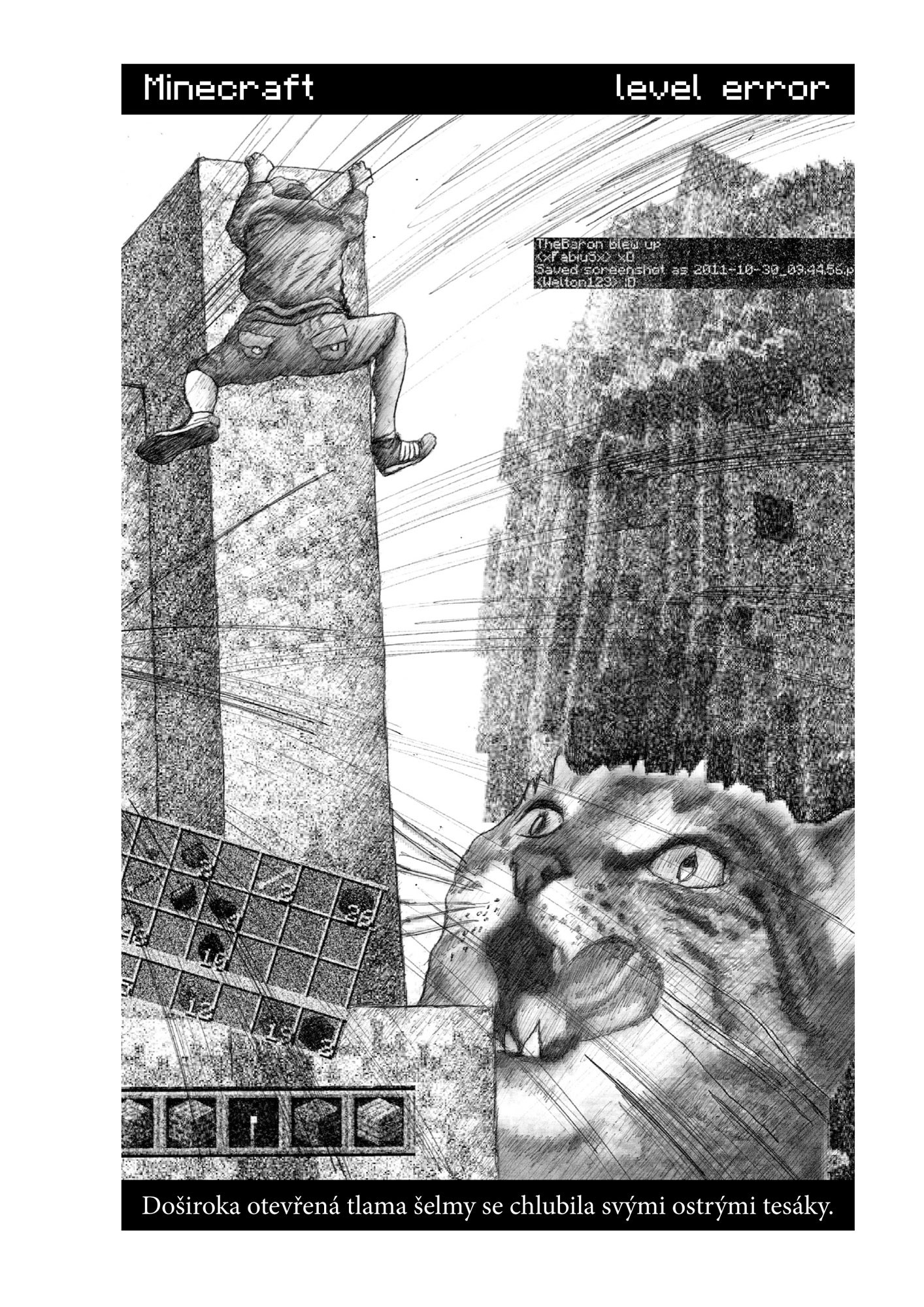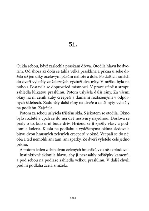 Všechno funguje a je v naprosté pohodě. Creepera zničí pět šípů nebo kamenný meč, na skeletona jsou nejlepší šípy. Ovšem jen do té chvíle, než při rozehrané hře udeří do domu blesk, zkratuje elektrické vedení a přesměruje wi-fi signál na samotné peklo. David s Lukášem jsou vrženi do Minecraftu, o kterém si mysleli, že ho dobře znají. Setkání s prvním creeperem je ovšem přesvědčí, že všechno je jinak. Hra napadená virem přestává respektovat původní pravidla, mobové odhazují své krotké masky a stávají se z nich krvelačné bestie. Navíc se ve hře ocitla také spolužačka Zuzka, která ji nikdy nehrála a vůbec netuší, o co jde. Lukáš s Davidem už vědí, že o život. Naštěstí jim fungují mobily a Romanův záchranný tým v obýváku u laptopu dělá všechno pro to, aby je z toho dostal. Jenže zmutovaní endermani mají svůj ďábelský plán a čas se neúprosně krátí…