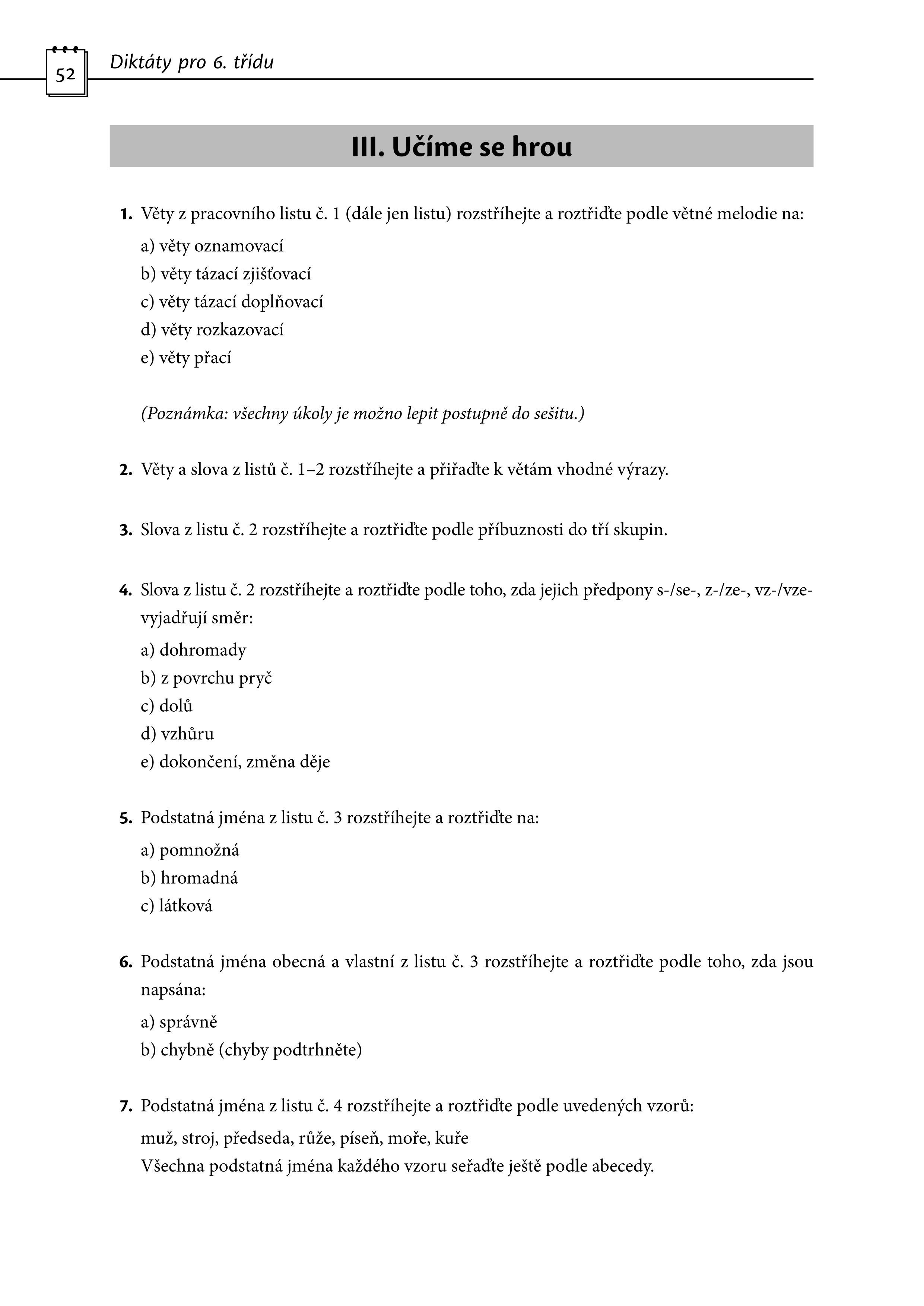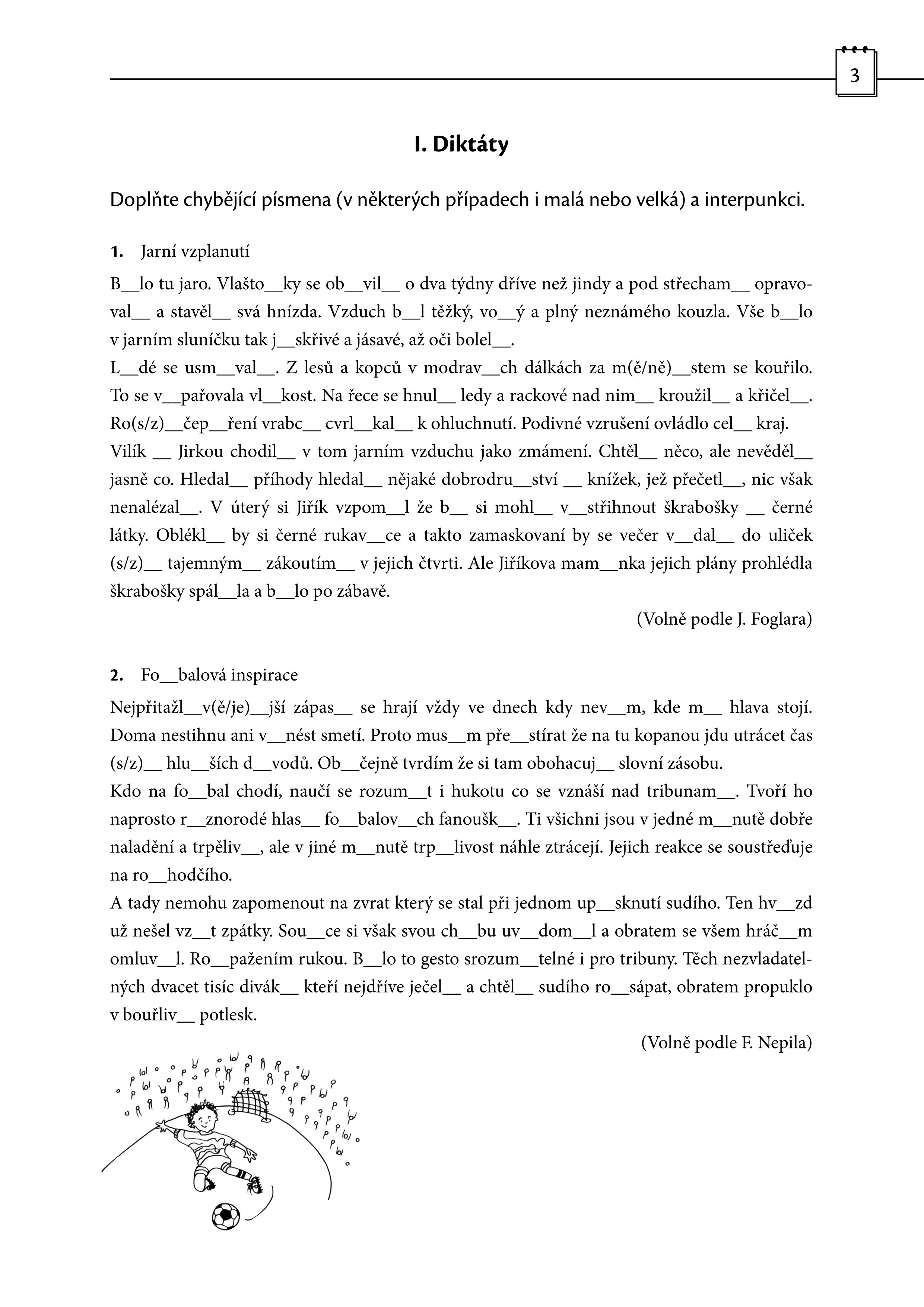 1) 15 doplňovacích diktátů: vychází z probíraného učiva, lze je také diktovat podle klíče, který se nachází na konci publikace. Každý diktát tvoří kratičký příběh.